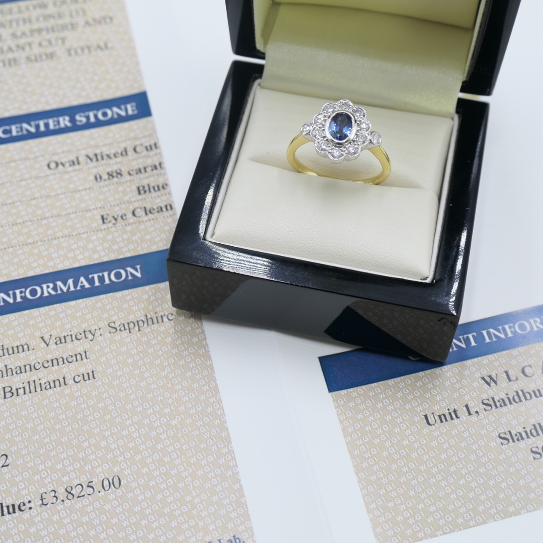 A brand-new, unused, certified 18ct white and yellow gold natural diamond and blue sapphire flower-shaped cluster ring, this exquisite piece is a timeless celebration of colour, elegance, and expert craftsmanship. At the centre of the design sits a vivid 0.88ct oval mixed-cut blue sapphire, rich in depth and tone, radiating a regal blue hue that symbolises wisdom, loyalty, and inner strength.