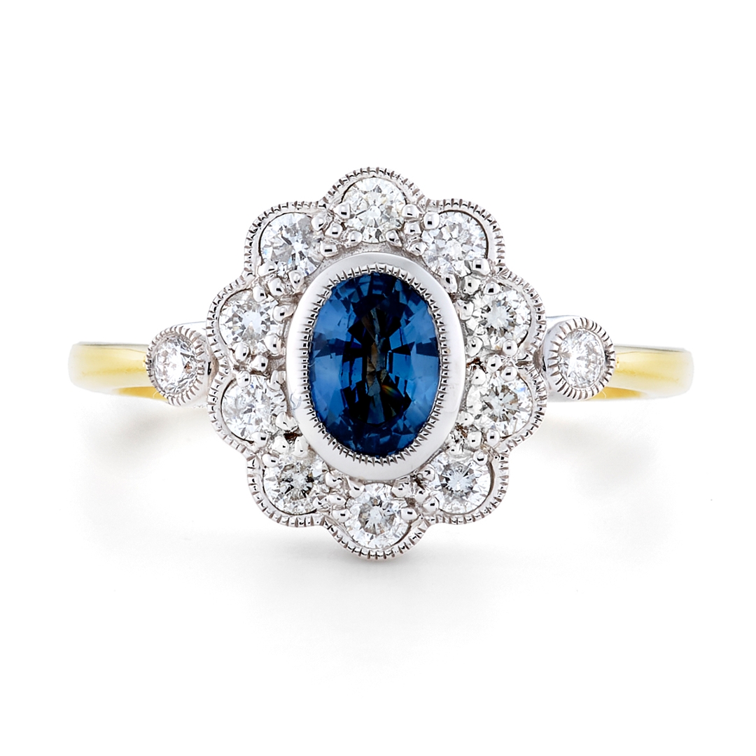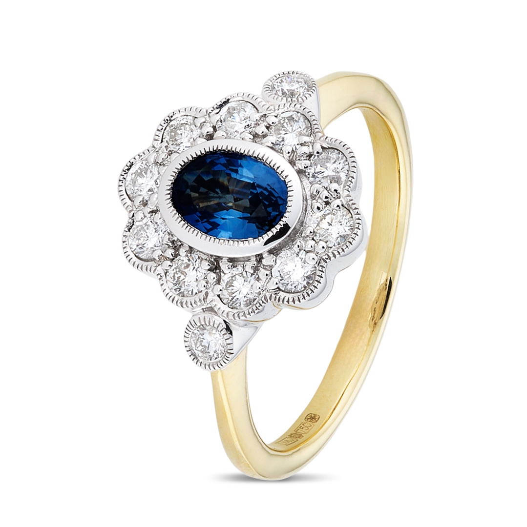 A brand new, unused, certified natural diamond & blue sapphire gemstone flower-shaped cluster ring, set with one oval mixed cut blue sapphire gemstone to the centre & a cluster of brilliant cut diamonds in a halo setting, set in 18ct white & yellow gold.