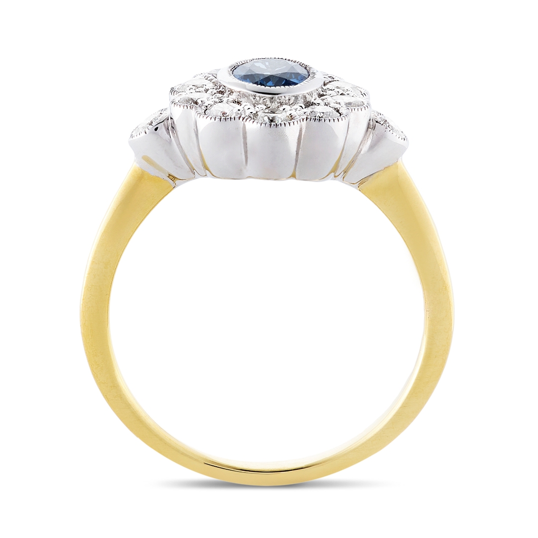 Surrounding the sapphire is a sparkling halo of brilliant-cut natural diamonds, artfully arranged in a flower-shaped cluster. The diamonds, totalling 0.44ct, are graded SI1 to SI2 in clarity and G to H in colour, offering a dazzling contrast against the deep sapphire centre. Their brilliance enhances the beauty of the central stone, creating a soft yet striking floral silhouette that catches the eye from every angle.