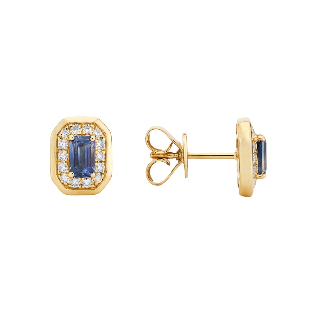 A brand-new, unused and certified pair of natural diamond and blue sapphire cluster earrings, designed in a refined Asscher-shaped form, each set with an octagonal step-cut blue sapphire at the centre and surrounded by a halo of brilliant-cut natural diamonds. The geometric precision of the design enhances the depth and structure of the sapphires, while the 9ct yellow gold setting adds warmth and a classic finish to the overall look.