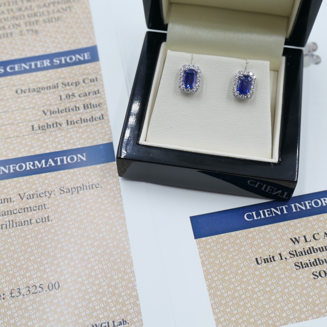 A brand-new, unused certified pair of natural diamond and blue sapphire gemstone cluster earrings, elegantly crafted in 18ct white gold. Each earring features a striking octagonal step-cut blue sapphire, weighing 1.05 carats, with a captivating violetish-blue hue that embodies timeless sophistication and royal allure. Surrounding each sapphire is a radiant cluster of brilliant-cut natural diamonds, totalling 0.32 carats, with G-H colour and SI1–SI2 clarity. Their crisp brilliance enhances the rich tone of the sapphires, while the sleek white gold setting adds a refined contemporary edge, allowing each gemstone to sparkle with exceptional clarity and depth.
