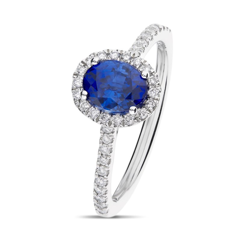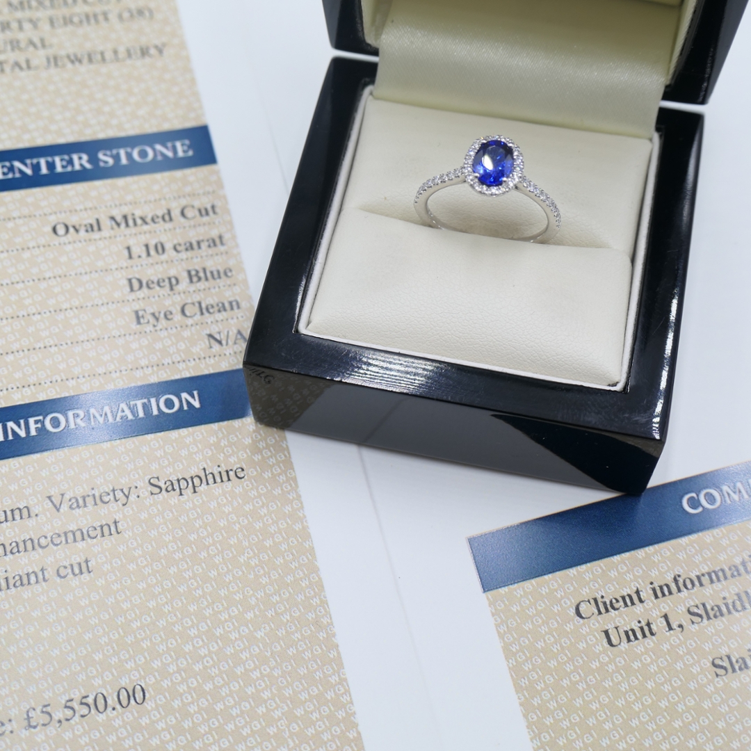 A brand new, unused, certified natural diamond & blue sapphire gemstone cluster ring, set with an oval mixed-cut blue sapphire gemstone to the centre & a cluster of brilliant cut diamonds in a halo setting & to the shoulders, set in platinum.