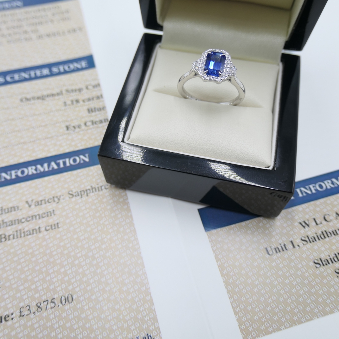 A brand new, unused, certified platinum natural diamond and blue sapphire gemstone emerald-shaped cluster ring. This exquisite piece features a striking octagonal step-cut blue sapphire at the centre, weighing 1.18 carats. The sapphire’s rich blue hue exudes a timeless elegance, making it the perfect focal point. Surrounding the sapphire is a halo of brilliant-cut diamonds, totalling 0.17 carats, which add a stunning sparkle, enhancing the vibrant colour of the central stone. The diamonds are of exceptional quality, with clarity ranging from SI1 to SI2 and a G-H colour grade, ensuring remarkable brilliance and clarity.