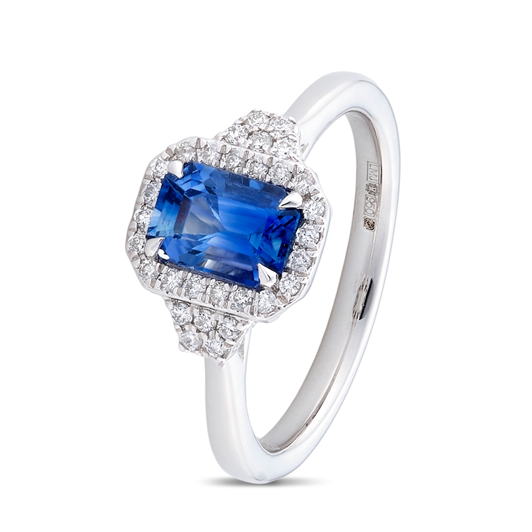 A brand-new, unused, certified natural diamond & blue sapphire emerald-shaped cluster ring, set with one octagonal step-cut blue sapphire gemstone to the centre & a cluster of brilliant-cut diamonds in a halo setting, set in platinum.