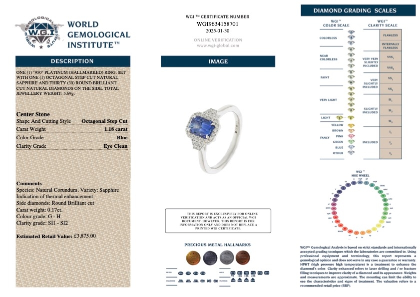 Crafted from luxurious platinum, this ring offers both durability and a lustrous finish. Weighing 5.69 grams. The contrast between the deep blue sapphire and the brilliant diamonds creates a sophisticated and eye-catching design. Valued at £3,875, this ring is not only a beautiful piece of jewellery but also a valuable investment.