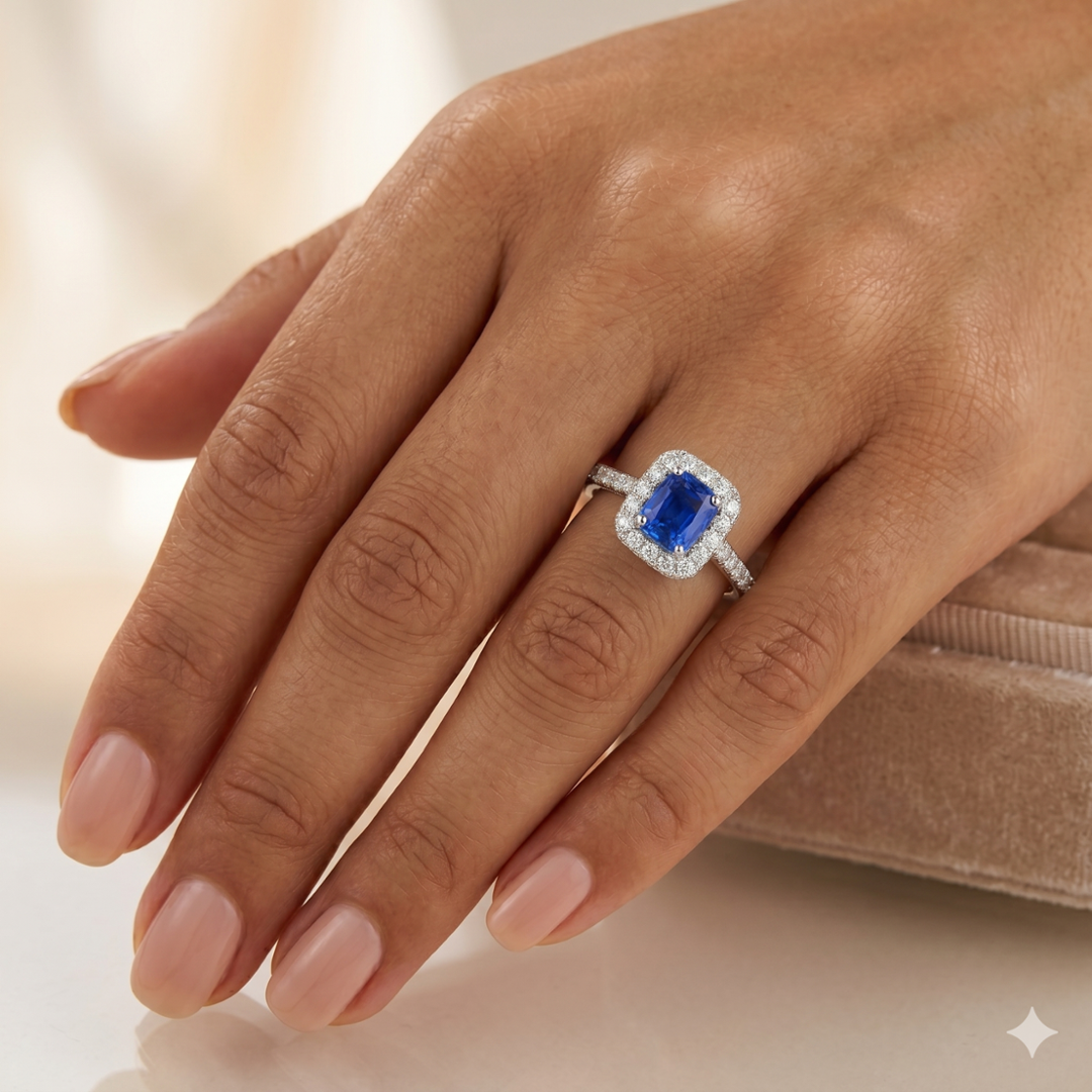A brand-new, unused, certified natural diamond and blue sapphire asscher-shaped cluster ring set in platinum, presenting a confident blend of colour, structure and lasting refinement. At the centre is a radiant-cut blue sapphire weighing 1.27 carats, chosen for its vibrant saturation and lively brilliance, combining sharp geometry with excellent light return. The sapphire is framed by a halo of brilliant-cut natural diamonds, enhancing contrast and depth while reinforcing the design's strong outline. Additional brilliant-cut diamonds extend along the shoulders, adding measured sparkle and a seamless visual flow across the ring.