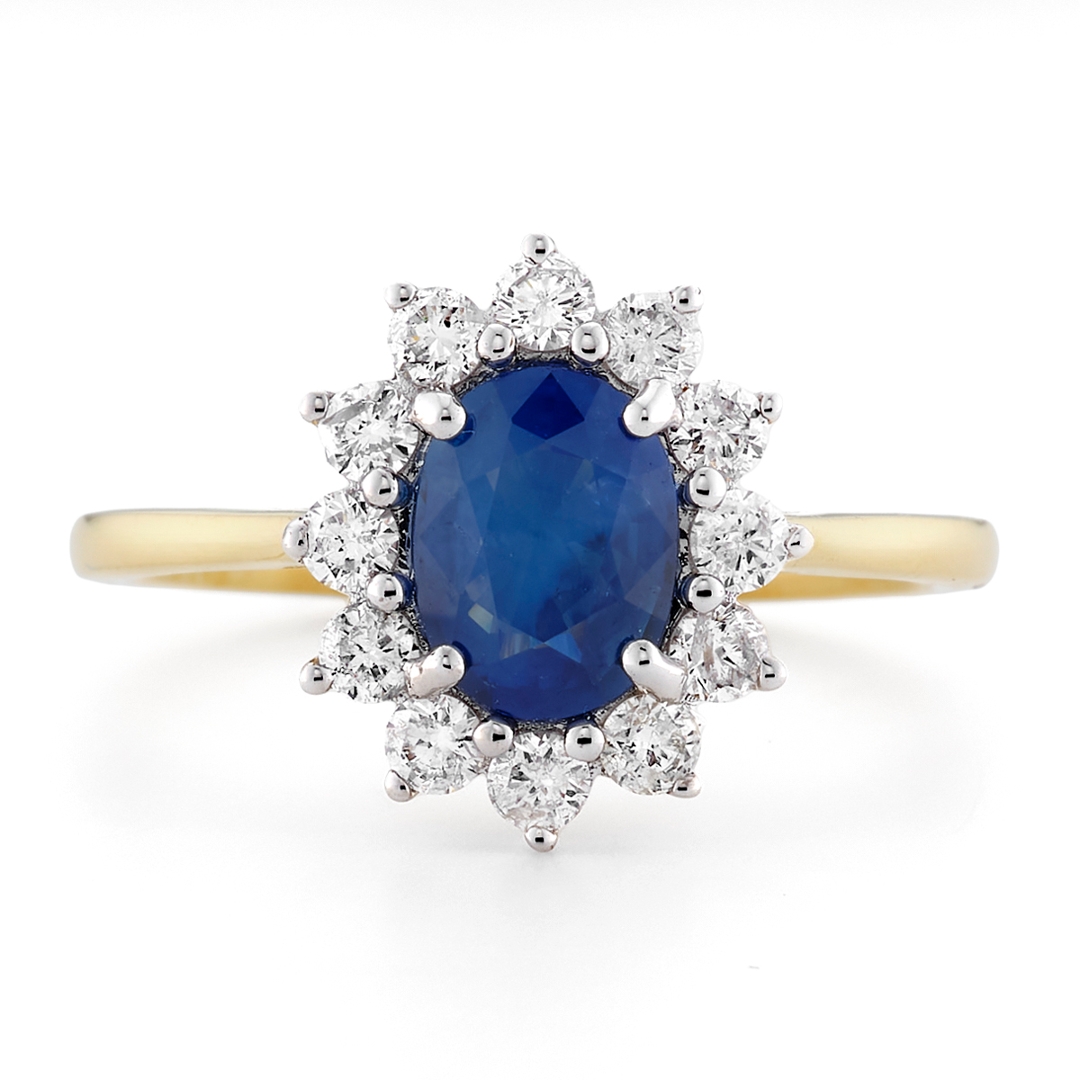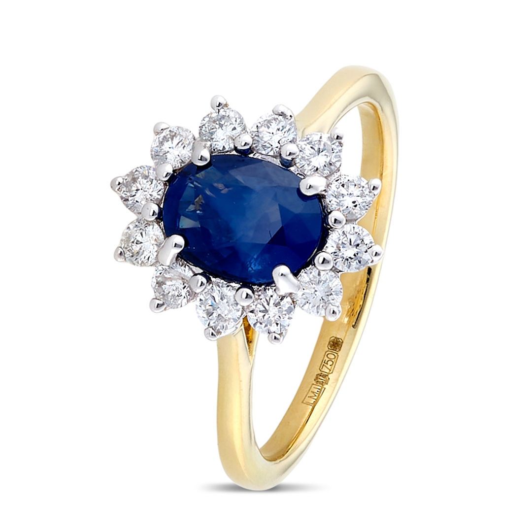 A brand-new, unused, certified natural diamond & blue sapphire gemstone cluster ring, set with one oval mixed-cut blue sapphire gemstone at the centre & a cluster of brilliant-cut diamonds in a halo setting, set in 18ct white & yellow gold.