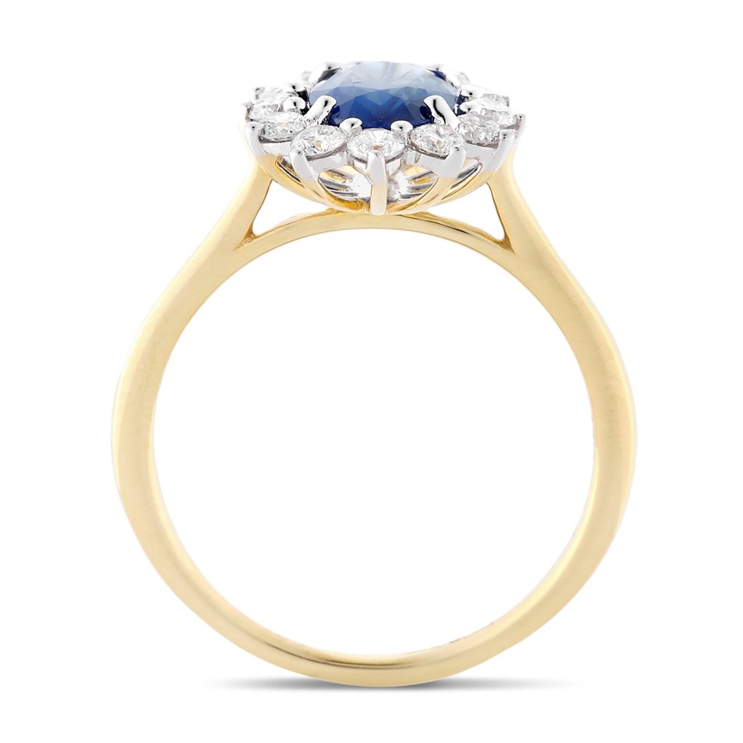 Crafted from 18ct white and yellow gold, this ring contrasts the warm and cool tones, enhancing its overall elegance. The harmonious design of the rich blue sapphire and sparkling diamonds makes this ring a truly luxurious piece, perfect for both special occasions and everyday wear.