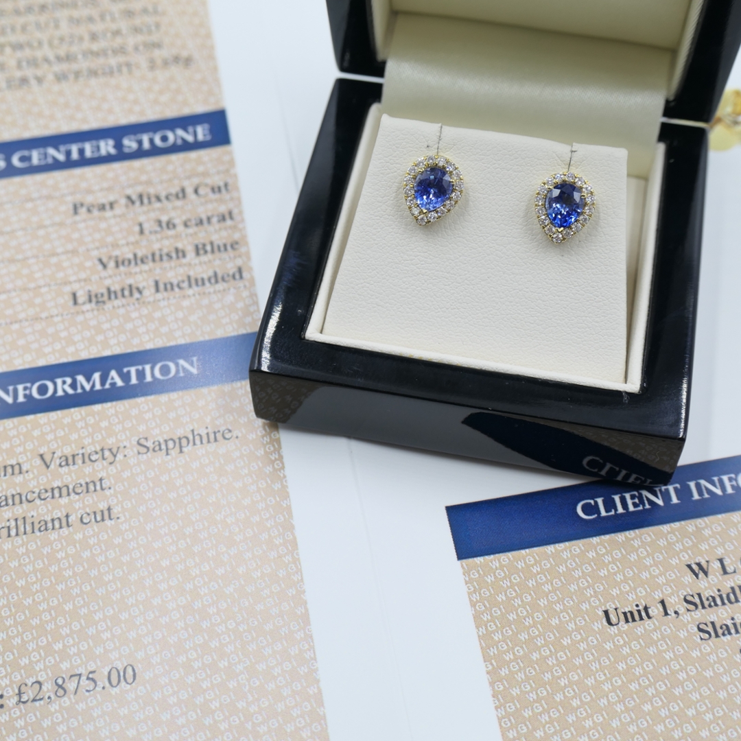 A brand-new, unused certified pair of natural diamond and blue sapphire gemstone cluster earrings, exquisitely crafted in 18ct yellow gold. Each earring features a stunning pear-shaped mixed-cut blue sapphire, totalling 1.36 carats, displaying a vivid violetish-blue hue that exudes timeless elegance and sophistication. Surrounding each sapphire is a refined cluster of brilliant-cut natural diamonds, totalling 0.29 carats, with G-H colour and SI1–SI2 clarity. The warm tone of the yellow gold setting beautifully complements the deep blue of the sapphires and the radiant sparkle of the diamonds, creating a luxurious design that effortlessly captures light and attention.