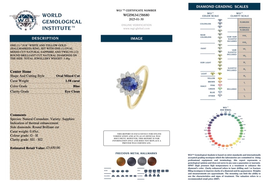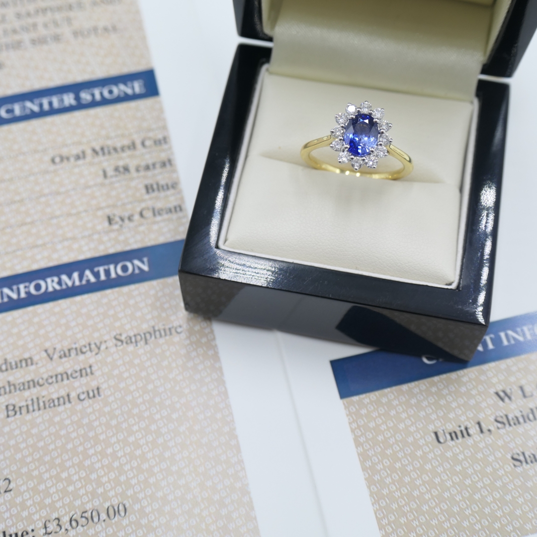 A brand-new, unused, certified 18ct yellow and white gold natural diamond and blue sapphire gemstone cluster ring, this exquisite piece combines luxury and enduring value. The ring features a 1.58ct oval mixed-cut blue sapphire at its centre, whose rich blue colour is striking and timeless. Surrounding the sapphire is a beautiful halo of brilliant-cut diamonds, totalling 0.45 carats. These diamonds, graded SI1-SI2 for clarity and G-H for colour, add a brilliant sparkle that enhances the sapphire’s natural beauty.