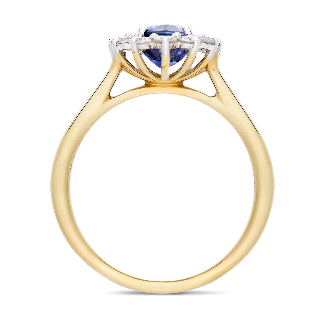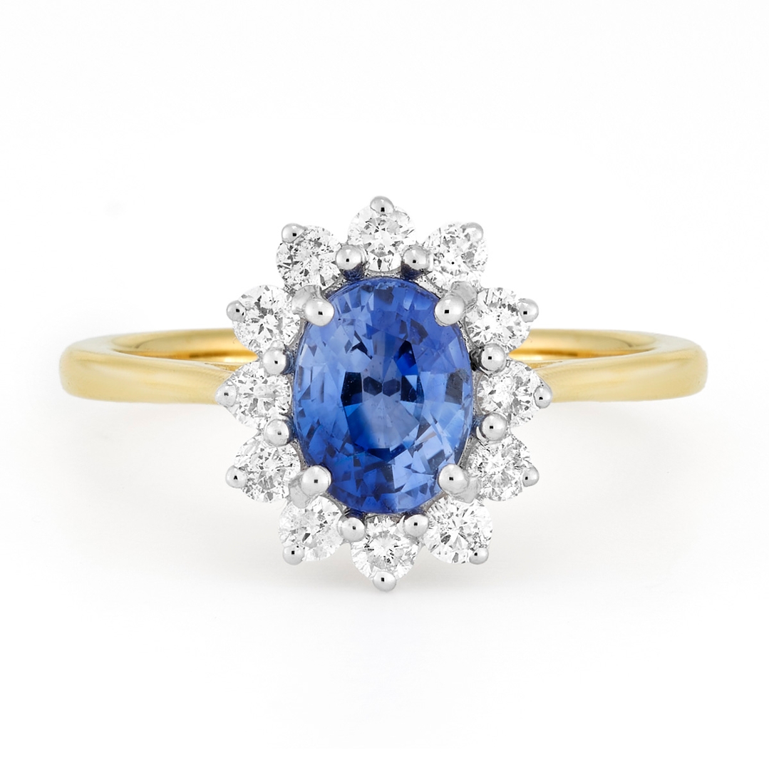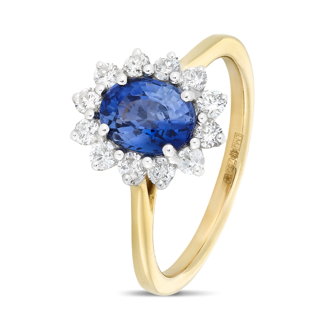 A brand-new, unused, certified natural diamond & blue sapphire gemstone cluster ring, set with one oval mixed-cut blue sapphire gemstone at the centre & a cluster of brilliant-cut diamonds in a halo setting, in 18ct yellow & white gold.