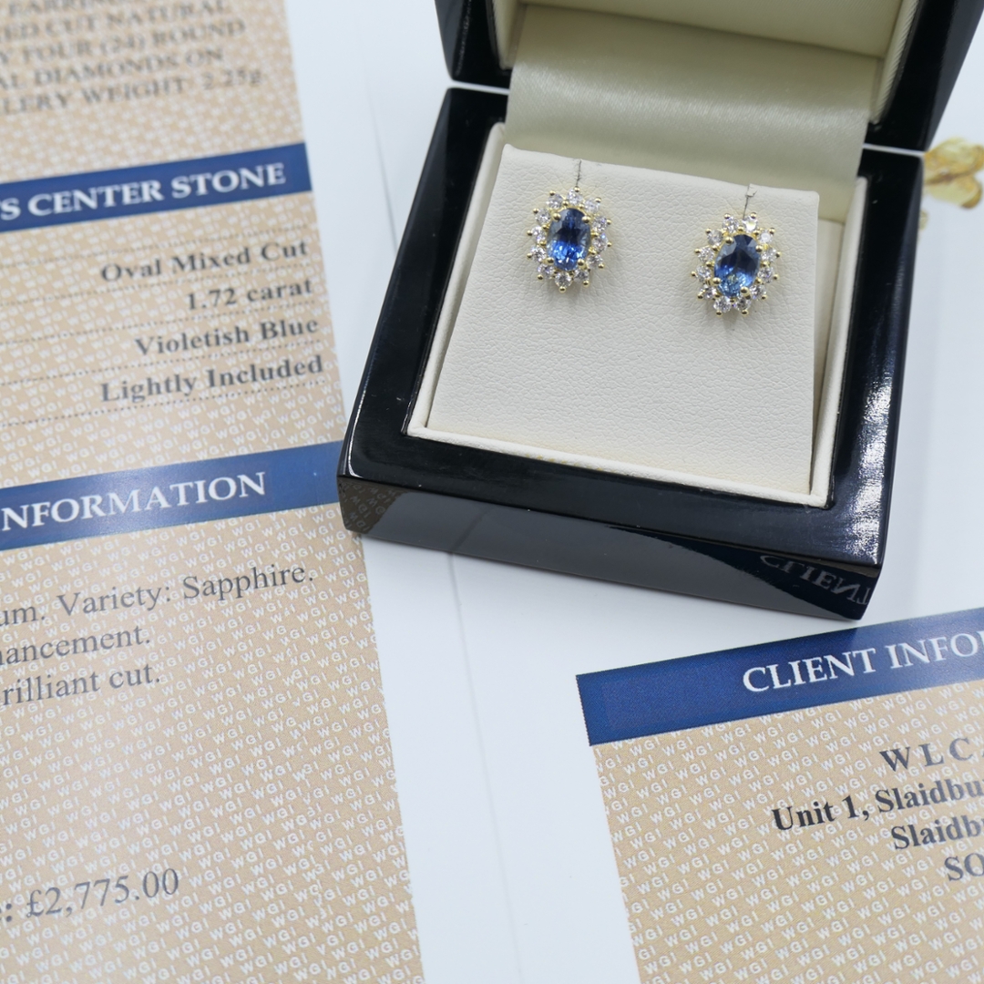 Natural diamonds are cherished worldwide for their exceptional rarity, brilliance, and enduring worth. As authentic treasures of the earth, they represent both everlasting beauty and reliable investment value, maintaining prestige across generations. With a total weight of 2.25 grams and an insurance valuation of £2,775.00, this certified pair of earrings captures the perfect harmony between craftsmanship, luxury, and long-term value. A truly exquisite piece, it unites the regal allure of blue sapphires with the enduring sparkle of natural diamonds—an elegant and investment-worthy addition to any fine jewellery collection.