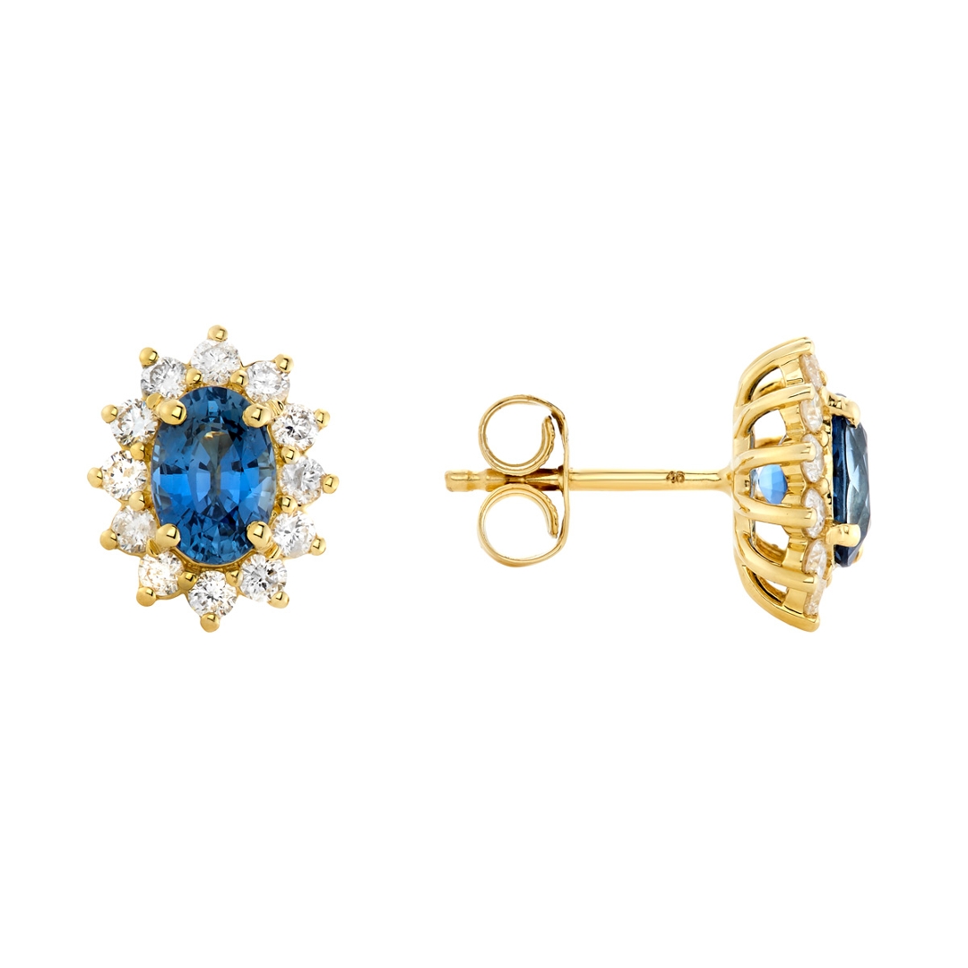A brand-new, unused certified pair of natural diamond and blue sapphire gemstone cluster earrings, elegantly crafted in 18ct yellow gold. Each earring features an oval mixed-cut blue sapphire, totalling 1.72 carats, displaying a rich violetish-blue hue that conveys depth and sophistication. Surrounding each sapphire is a refined cluster of brilliant-cut natural diamonds, totalling 0.50 carats, with G-H colour and SI1–SI2 clarity. The warm tone of the yellow gold setting enhances the vivid beauty of the sapphires while amplifying the diamonds’ crisp sparkle, creating a timeless design that exudes elegance and charm.