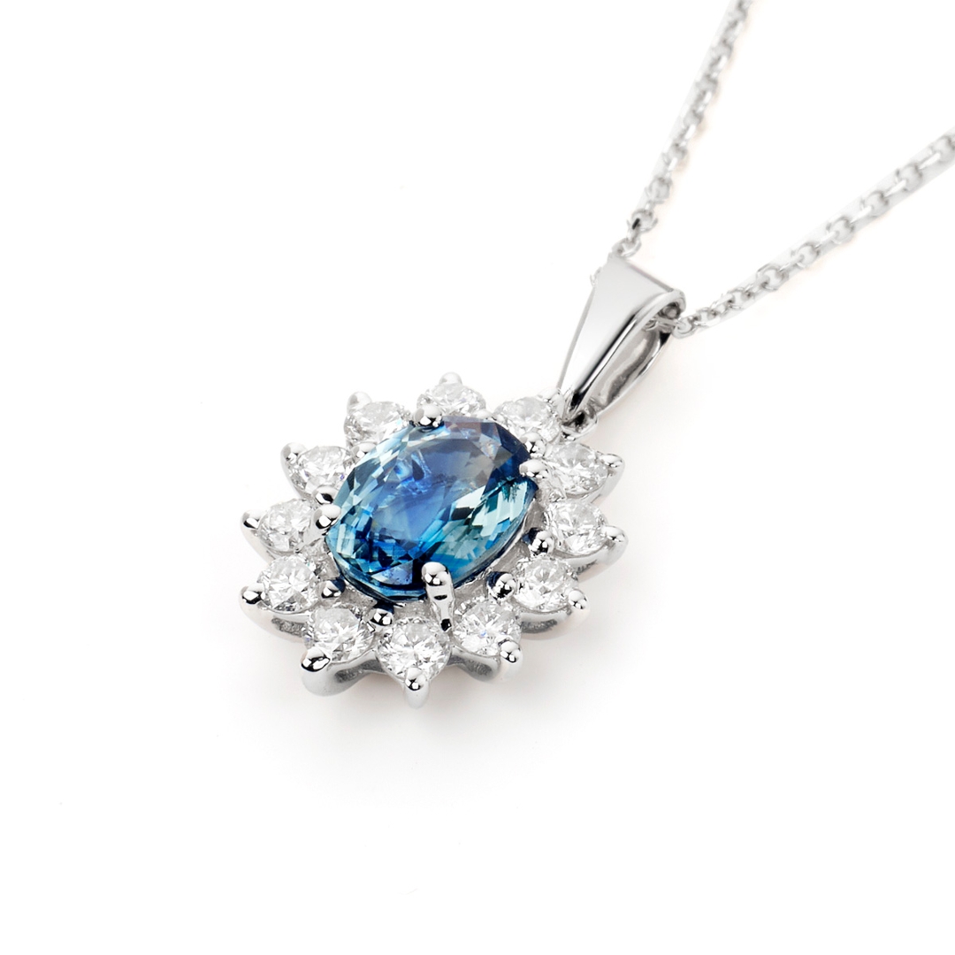 A brand-new, unused, certified natural diamond & blue sapphire cluster pendant, with one oval mixed-cut blue sapphire gemstone at the centre & twelve brilliant-cut diamonds in a halo setting, in 18ct white gold.