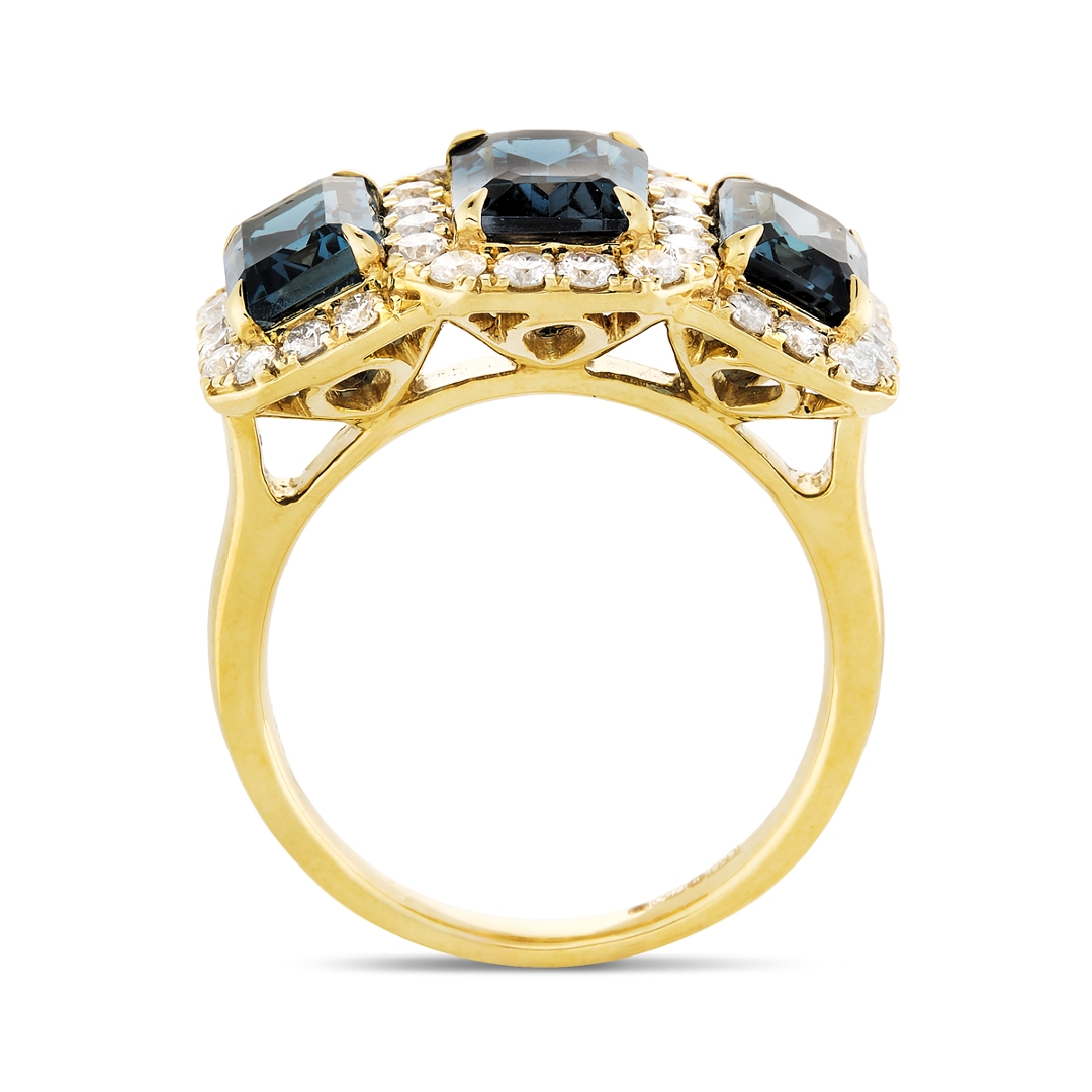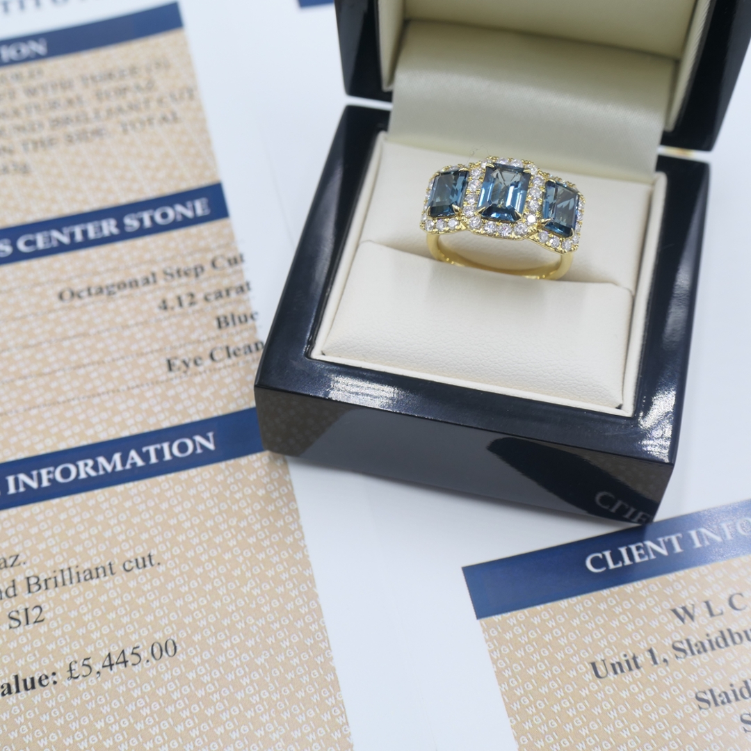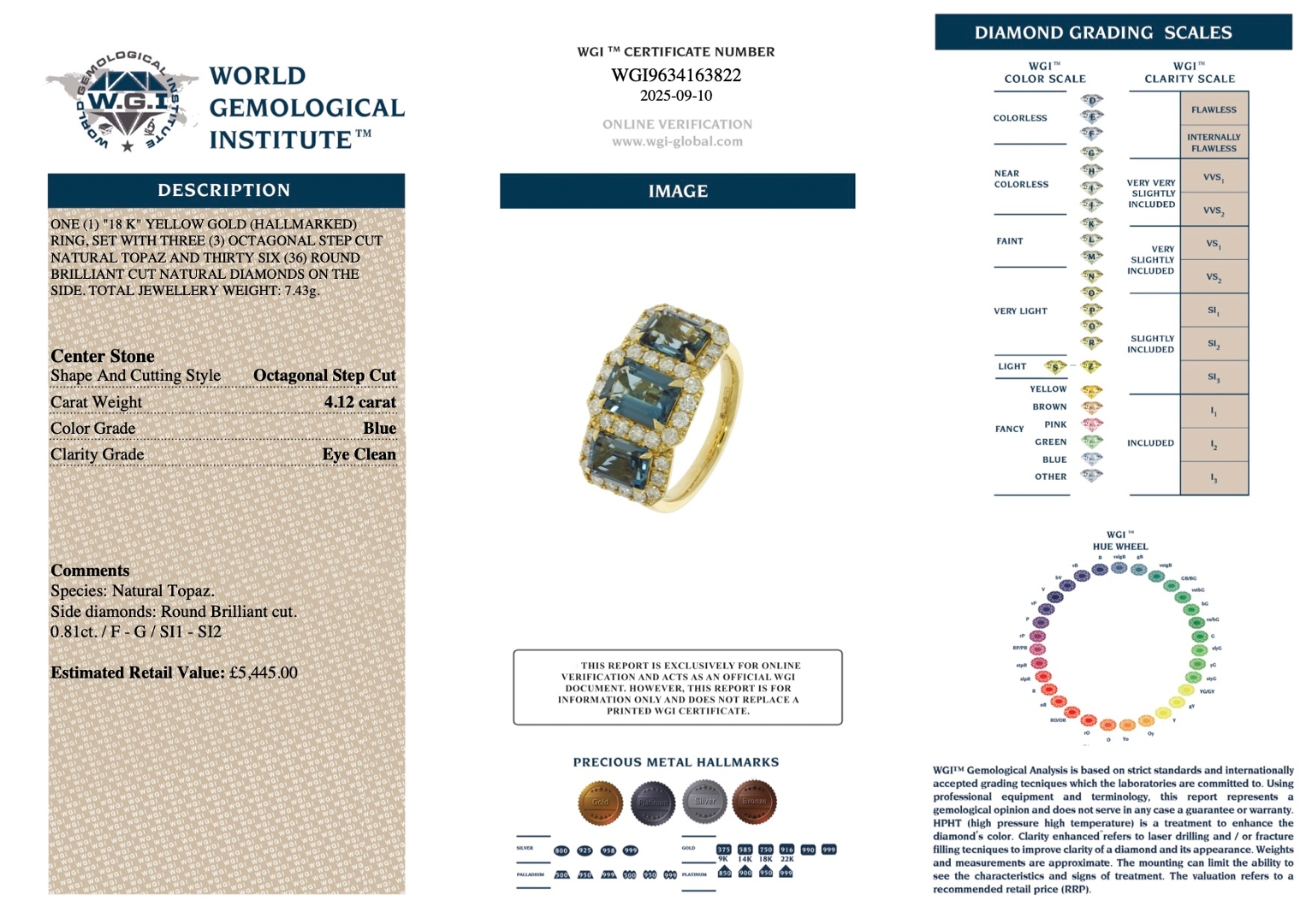 A brand-new, unused trio cluster ring crafted in certified 18ct yellow gold, this impressive design is set with three octagonal step-cut natural blue topaz gemstones totalling 4.12ct. The striking blue hue of the topaz is enriched by a halo of natural brilliant-cut diamonds surrounding each stone, with additional diamonds set along the shoulders to enhance its brilliance. The diamonds, totalling 0.81ct, are graded F–G in colour and SI1–SI2 in clarity, delivering exceptional sparkle that contrasts beautifully with the depth of the blue topaz. The rich warmth of yellow gold complements the stones perfectly, making this ring a statement of elegance and refinement.