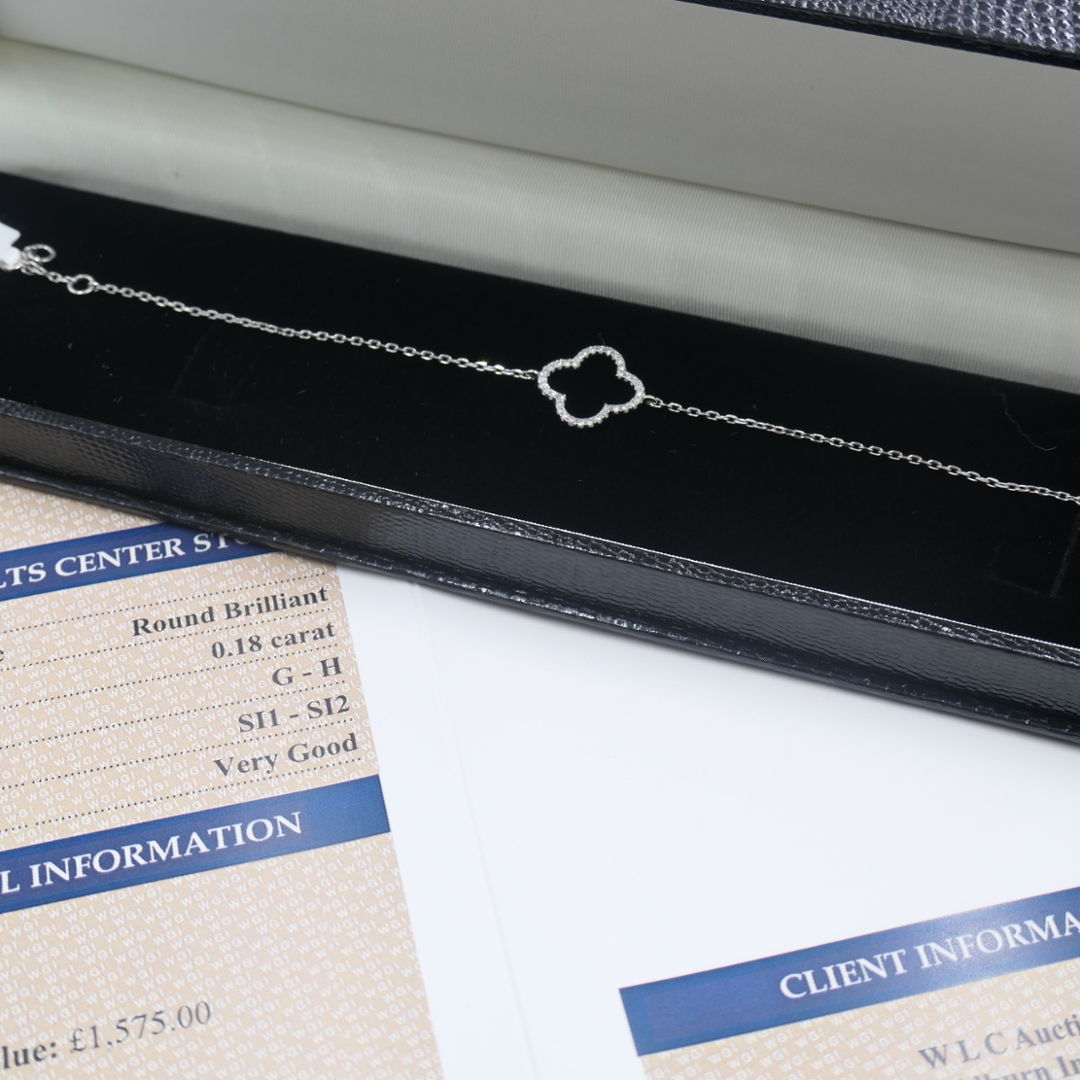 A brand-new, unused 18ct white gold diamond bracelet showcasing the timeless appeal and natural beauty of earth-formed diamonds. Crafted with exceptional precision, this elegant piece features a delicate chain adorned with a stunning four-leaf clover motif, symbolising luck and love. The clover is beautifully set with thirty-six round brilliant-cut natural diamonds, totalling 0.18ct, each carefully selected for its sparkle and radiance. Graded G–H in colour and SI1–SI2 in clarity, the diamonds offer a soft, captivating brilliance that complements the delicate white gold setting perfectly.