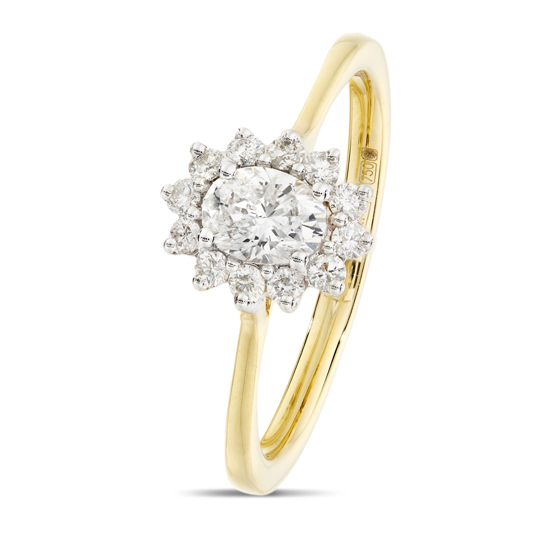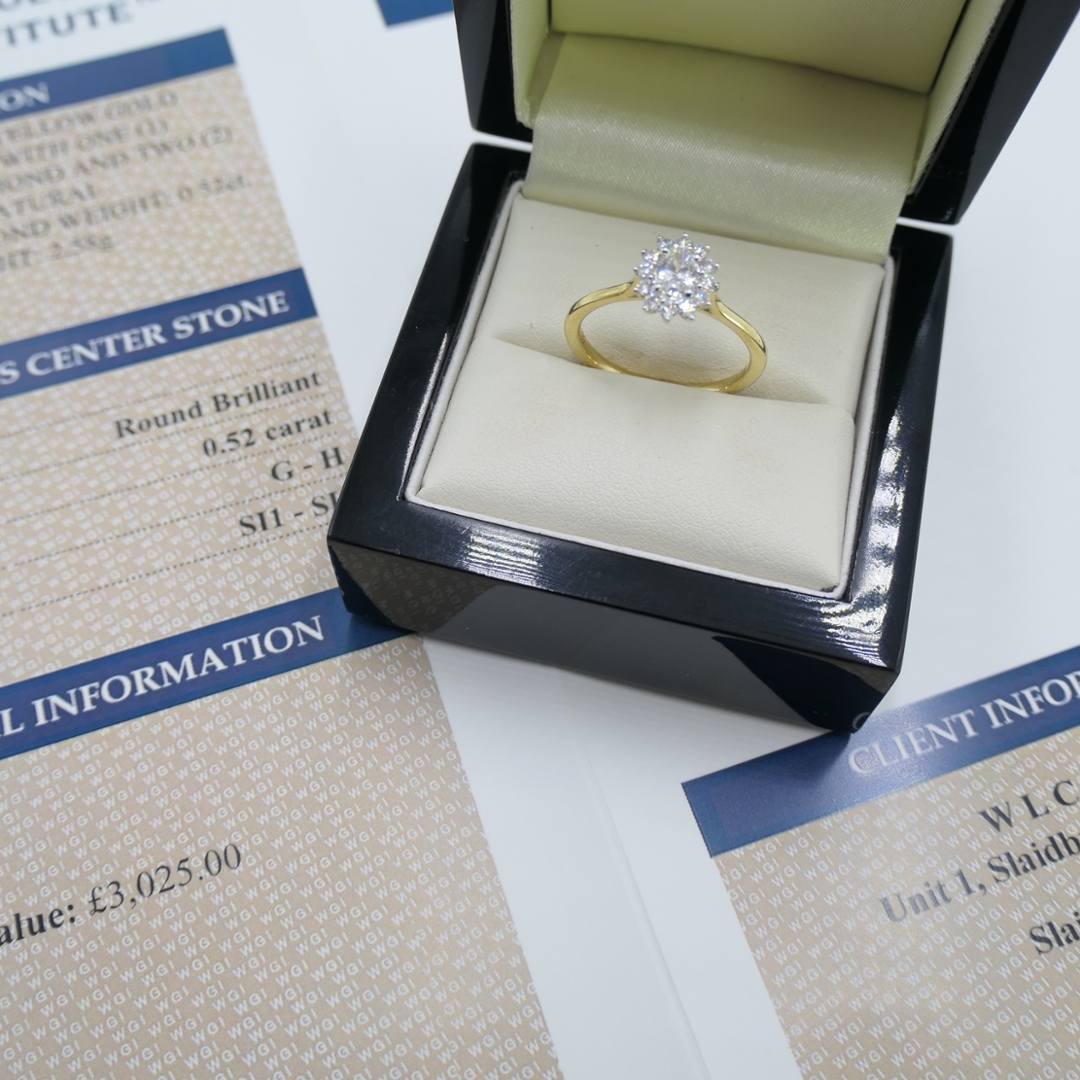 A brand-new, unused certified natural diamond cluster ring that beautifully combines classic design with modern elegance. Expertly crafted in 18ct white and yellow gold, this exquisite piece features a 0.52-carat arrangement of natural diamonds, with an oval-cut diamond at its centre surrounded by a delicate halo of brilliant-cut stones. Each diamond, graded G–H in colour and SI1–SI2 in clarity, has been carefully selected for its radiant sparkle and harmonious balance, creating a mesmerising play of light from every angle. The dual-tone gold enhances the brilliance of the diamonds, with white gold accentuating their luminosity and yellow gold adding a warm, traditional charm.