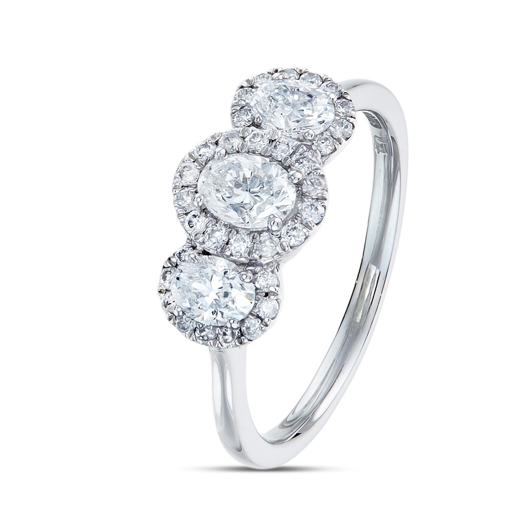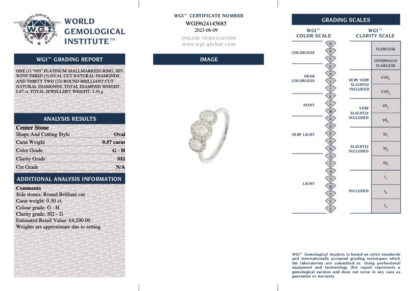 Certified for quality assurance, the oval diamonds boast a total weight of 0.57 carats, a clarity grade of SI2, and a colour grade of G-H, radiating brilliance and charm. The brilliant-cut diamonds, totalling 0.30 carats, exhibit a clarity range of SI2-I1 and a colour grade of G-H, adding to the ring's allure.