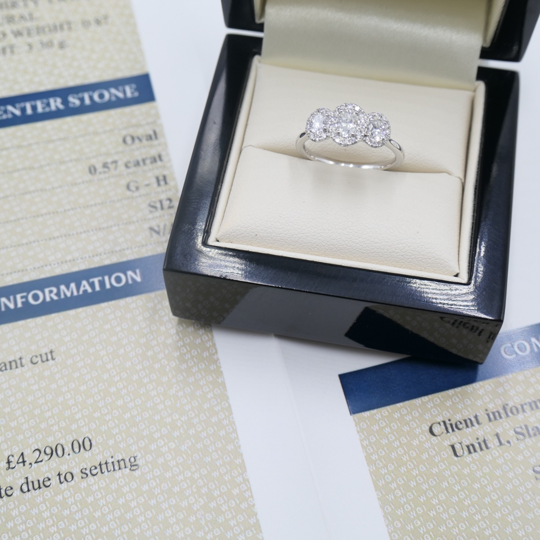 A brand-new, unused, certified platinum natural diamond cluster ring is a mesmerising symbol of elegance and sophistication. This exquisite ring features three oval-cut diamonds at the centre, surrounded by a halo setting of 32 brilliant-cut diamonds, all set in luxurious 18ct white gold.