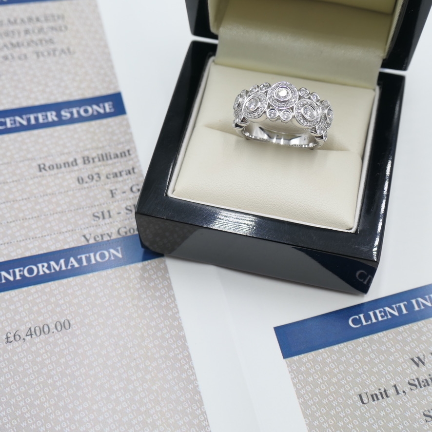 The platinum setting enhances the diamonds’ natural luminosity, offering both strength and elegance, while the ring's substantial weight conveys a reassuring sense of quality and permanence. This is not merely a piece of jewellery, but a symbol of enduring beauty — an investment in craftsmanship and precious materials that will be treasured for generations.