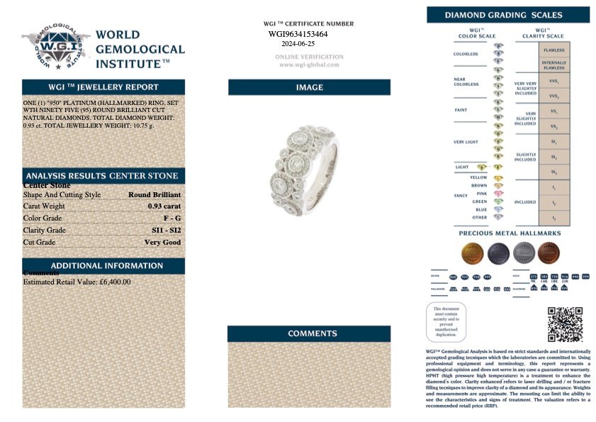 A brand new, unused, certified natural diamond cluster ring, beautifully crafted in platinum and weighing an impressive 10.75 grams. This remarkable piece showcases a stunning cluster of brilliant-cut natural diamonds totalling 0.93ct, with clarity grades ranging from SI1 to SI2 and a fine colour range of F to G. The diamonds radiate exceptional fire and brilliance, perfectly positioned to capture and reflect light from every angle. Their expertly arranged cluster design adds a captivating depth and sparkle, creating a ring that exudes timeless sophistication and refined luxury.