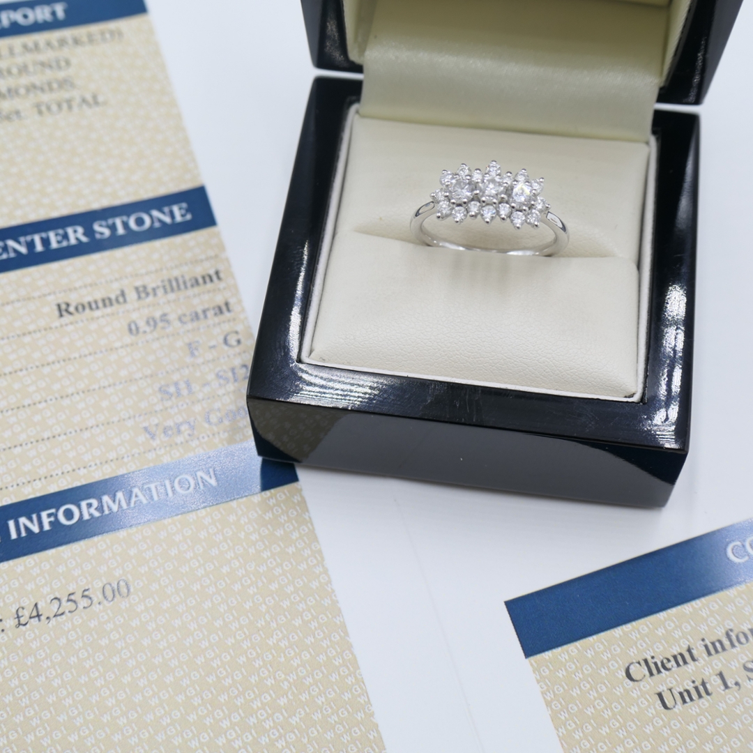 With a valuation of £4,255.00, this exquisite cluster ring represents a luxurious accessory and a sound investment opportunity. Its impressive diamond weight and high-quality characteristics ensure lasting value and enduring beauty, making it a cherished addition to any jewellery collection.