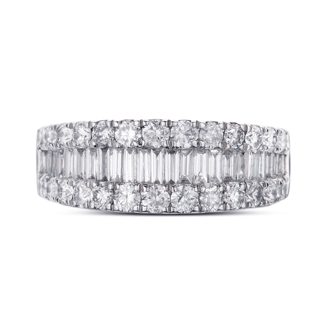 Crafted in luxurious platinum and weighing 8.99 grams, the ring's setting complements the diamonds perfectly, providing a sleek, modern backdrop that enhances their sparkle. The combination of a baguette and brilliant-cut diamonds creates an intriguing contrast in shapes, adding depth to the overall design.