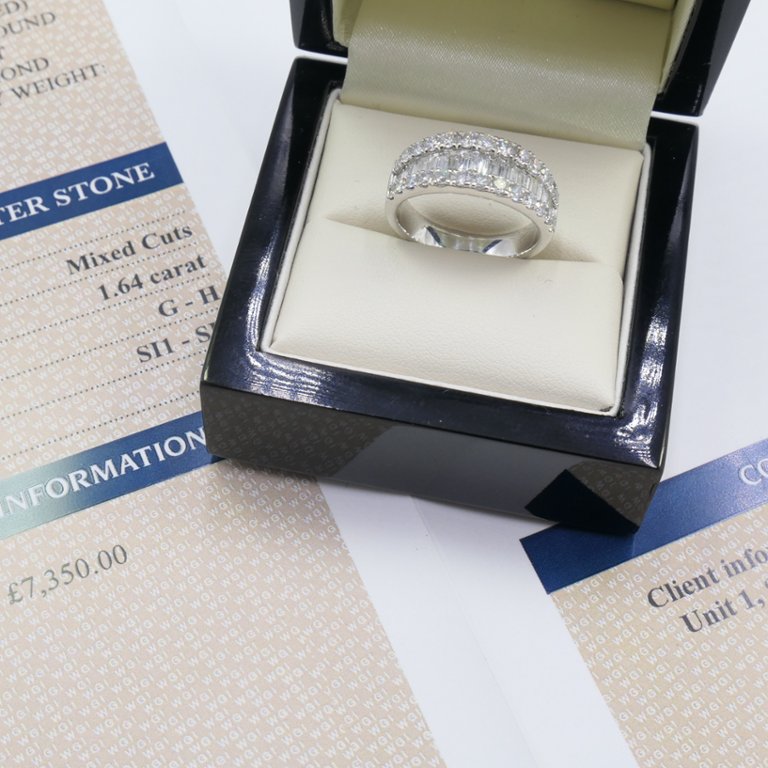 With a total diamond weight of 1.64 carats, this ring boasts a significant sparkle that will catch the eye from every angle. The diamonds are carefully selected for their quality, with a clarity grading of SI1-SI2, indicating that while some slight inclusions may be visible under magnification, they are not visible to the naked eye. The diamonds range from G to H in colour, ensuring a beautiful, harmonious display of brilliance.