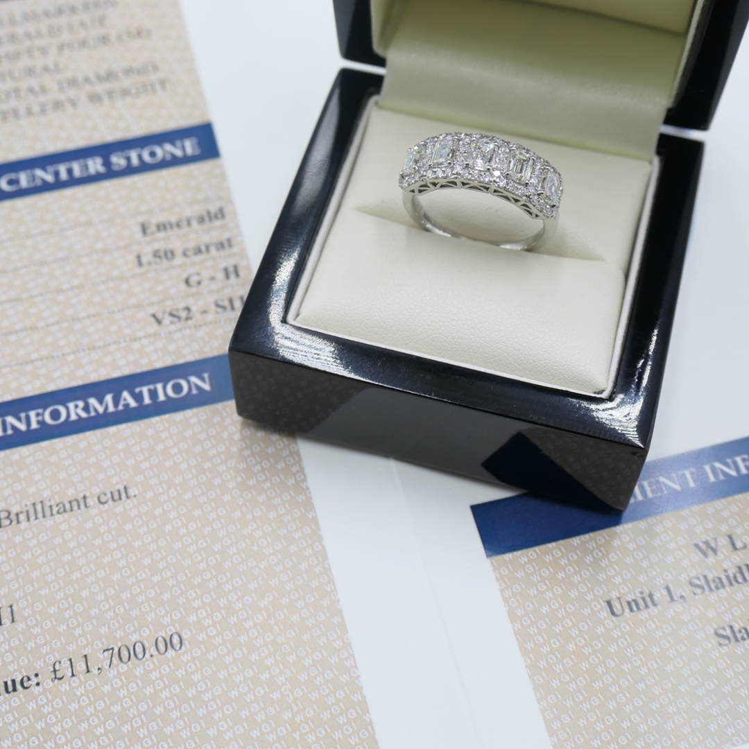 A brand-new, unused certified natural diamond cluster ring that showcases exceptional brilliance and refined sophistication. At its centre lies a breathtaking arrangement of emerald-cut and brilliant-cut natural diamonds, meticulously set to create a harmonious display of light and structure. The emerald-cut diamonds, totalling 1.50 carats and graded G–H in colour with VS2–SI1 clarity, exude timeless elegance with their sleek, mirror-like facets. Complementing them, 0.50 carats of brilliant-cut diamonds graded F–G in colour and VS2–SI1 in clarity add dazzling fire and scintillation, enhancing the design with radiant sparkle and dimension.