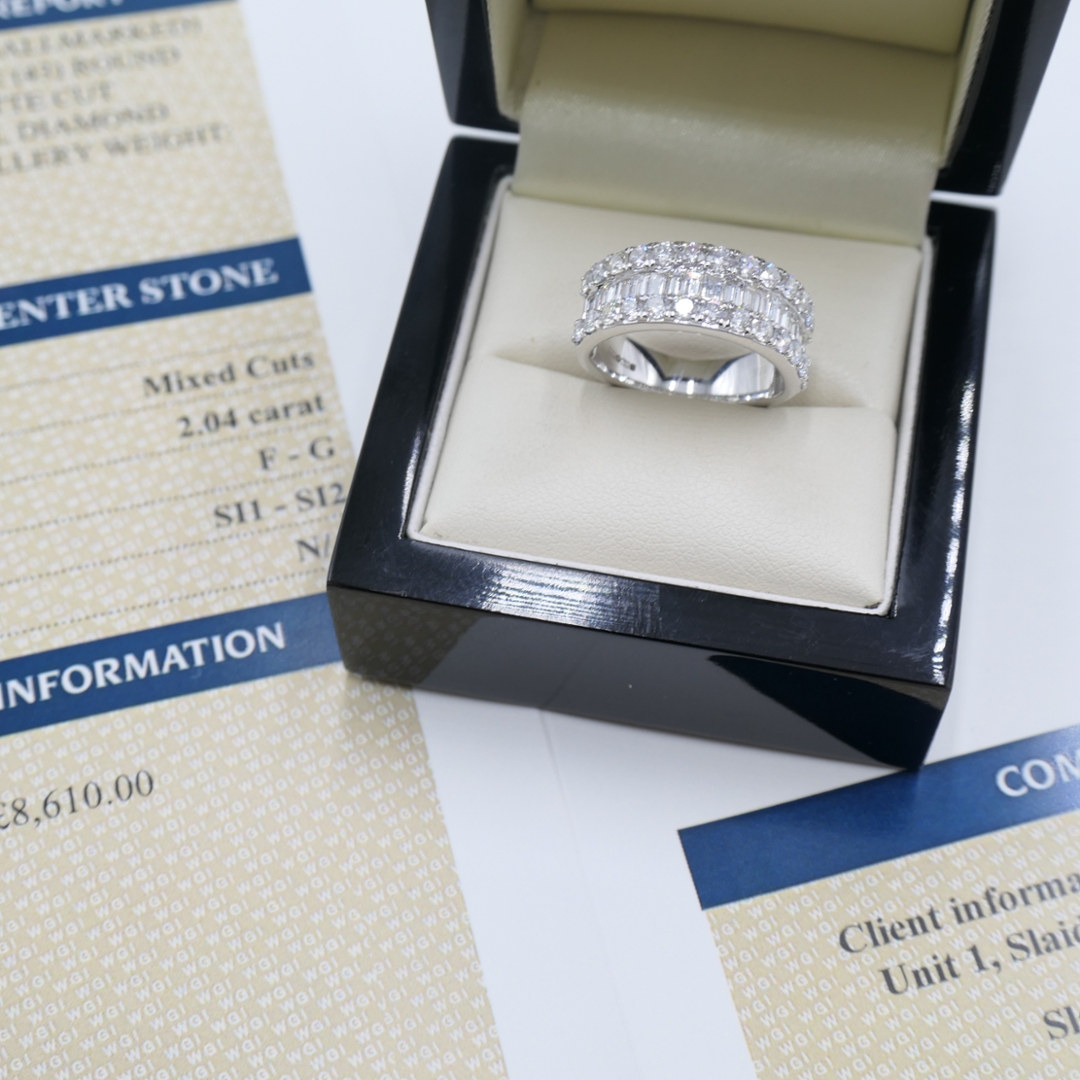 A brand-new, unused, certified 18ct white gold natural diamond cluster ring exudes timeless beauty and sophistication. It is adorned with a combination of baguette-cut and brilliant-cut diamonds totalling 2.04 carats and sparkles with radiant allure.