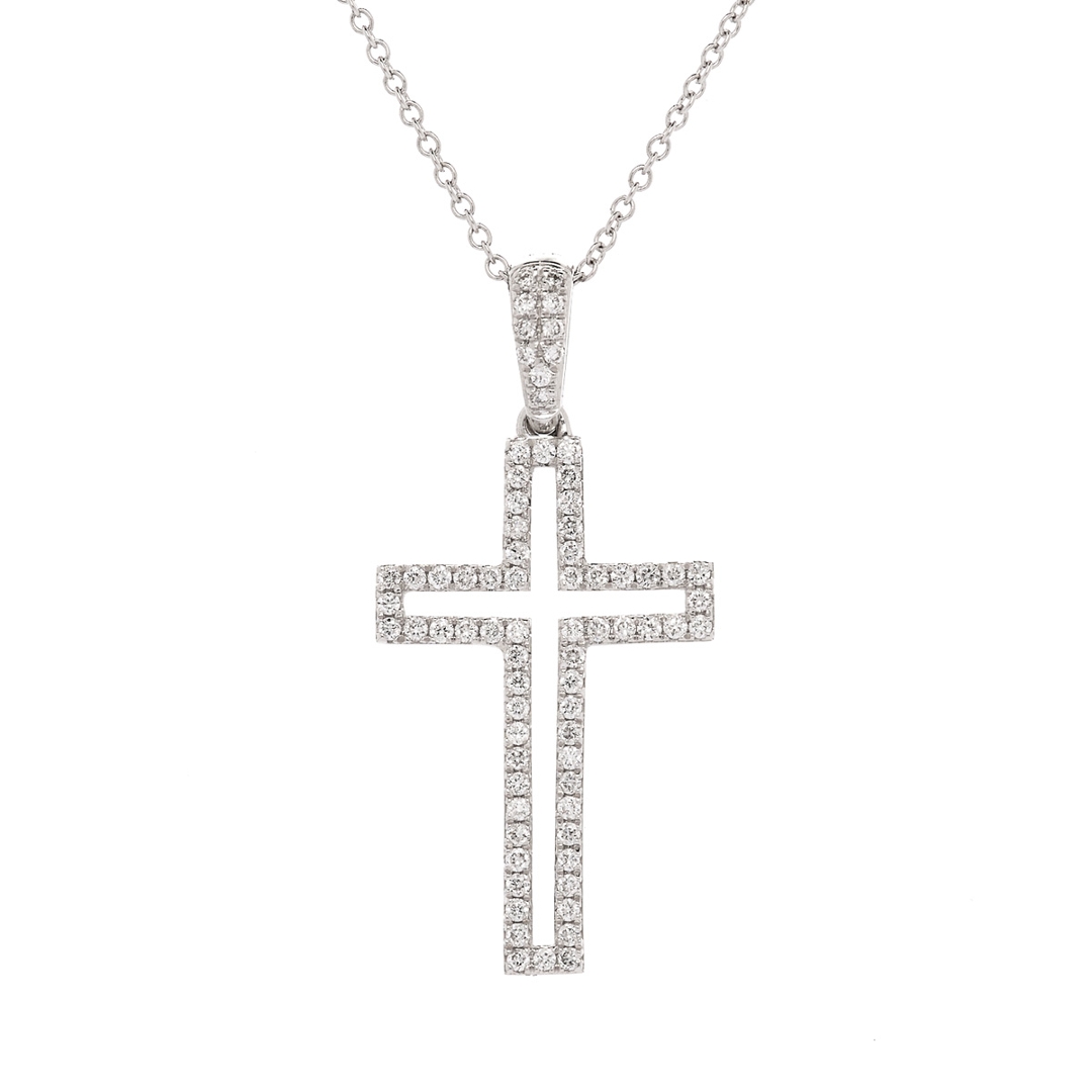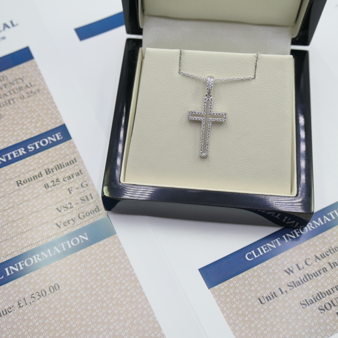 A brand new, unused, certified natural diamond cross pendant, set with brilliant cut diamonds, set in 18ct white gold.
