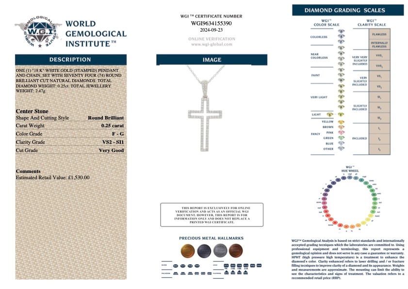 With a total diamond weight of 0.25 carats, the diamonds offer a beautiful, eye-catching shimmer, making the pendant suitable for everyday wear and special occasions. The diamonds are graded VS2-SI1 for clarity, meaning they have very slight inclusions that are not visible to the naked eye, ensuring they appear bright and clear. The F-G colour grade ensures that the diamonds are near-colourless, offering a crisp, vibrant brilliance that enhances the beauty of the 18ct white gold setting.