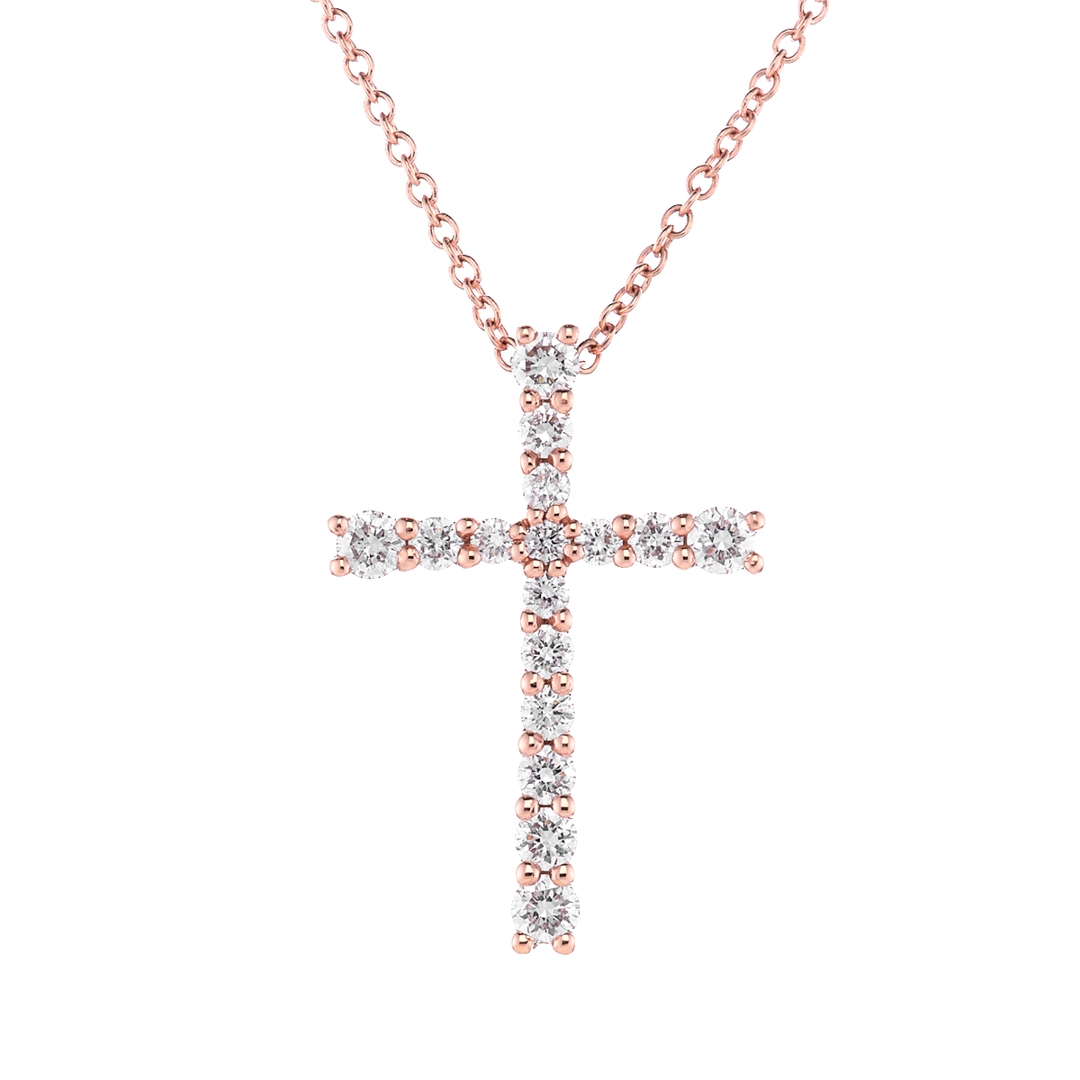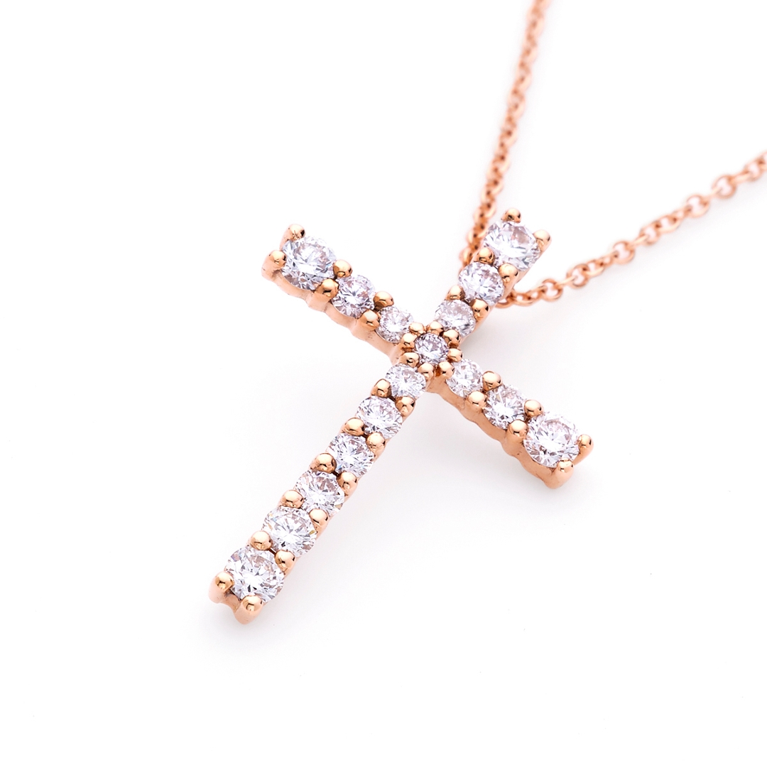A brand-new, unused, certified natural diamond cross pendant, set with brilliant-cut diamonds in a cross design, set in 18ct rose gold.