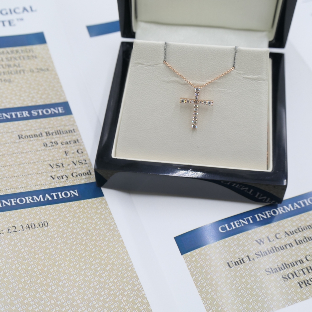 A brand-new, unused certified natural diamond cross pendant that perfectly captures the harmony of faith, elegance, and refined craftsmanship. Beautifully designed in warm 18ct rose gold, this graceful pendant features a striking cross motif adorned with brilliant-cut natural diamonds totalling 0.29 carats. Each diamond, graded F–G in colour and VS1–VS2 in clarity, has been expertly selected for its fire and brilliance, creating a radiant sparkle that contrasts beautifully against the soft blush tones of the rose gold. The result is a piece that feels timeless yet contemporary, exuding both luxury and grace.
