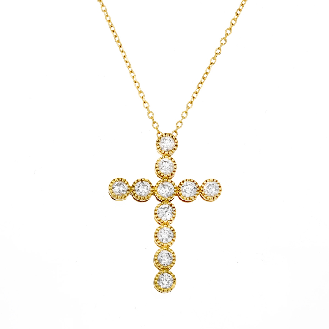 A brand-new, unused, certified natural diamond cross pendant, set with eleven brilliant cut diamonds, set in 18ct yellow gold.