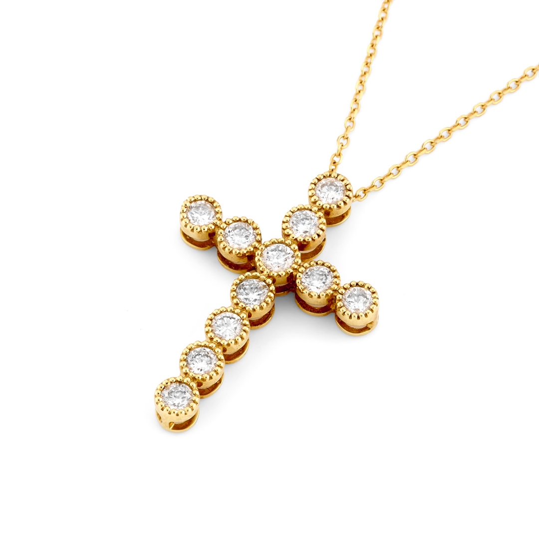 A brand-new, unused, certified 18ct yellow gold natural diamond cross pendant, finely crafted and set with eleven round brilliant-cut natural diamonds totalling 0.75 carats. The warm glow of yellow gold enhances the near-colourless brilliance of each diamond, graded H–I in colour and SI2–I1 in clarity. The cross formation radiates a refined balance of elegance and symbolism, making it a cherished piece suitable for both daily wear and formal occasions. Its craftsmanship and thoughtful proportion bring a sense of timeless sophistication to this meaningful design.