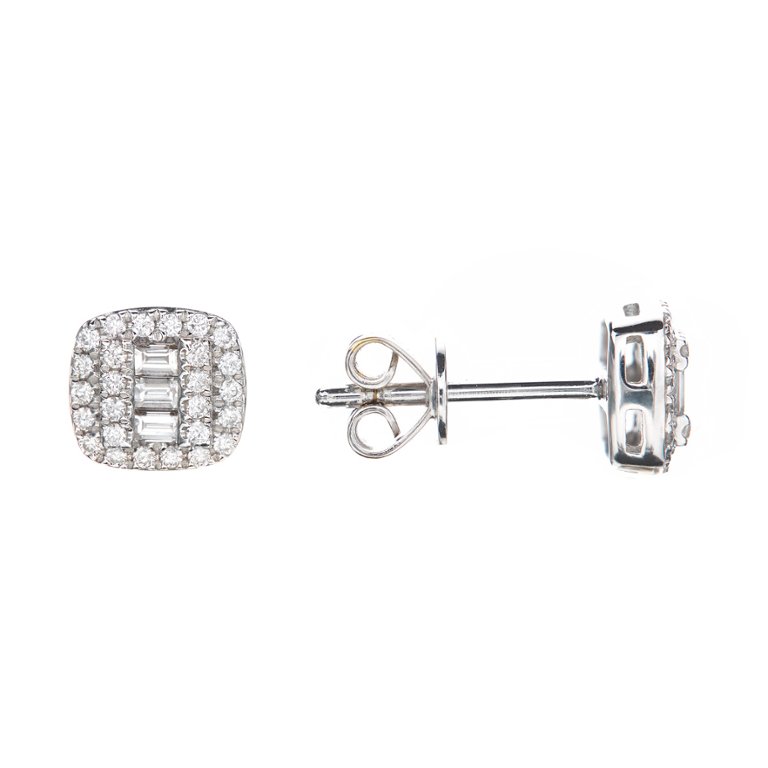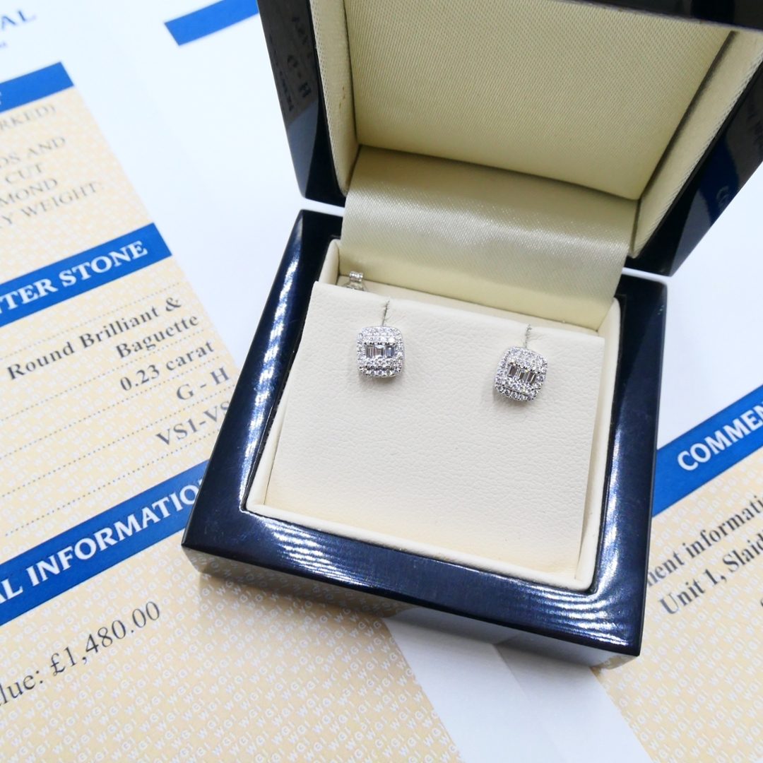 A brand-new, unused, certified 18ct white gold pair of natural diamond cushion-shaped cluster earrings, adorned with baguette-cut and brilliant-cut diamonds, offers a unique and captivating design. With a total diamond weight of 0.23 carats, these earrings feature a subtle yet alluring sparkle that enhances any ensemble. The diamonds featured in these earrings have clarity grades ranging from VS1 to VS2 and colour grades in the G to H range, indicating minimal inclusions and near-colourlessness. The craftsmanship and design of these earrings further enhance their investment appeal. The cushion-shaped cluster design, along with the interplay of baguette-cut and brilliant-cut diamonds, showcases artistry and sophistication. Additionally, using 18ct white gold as the setting not only enhances their aesthetic appeal but also underscores their intrinsic value as precious metal jewellery.