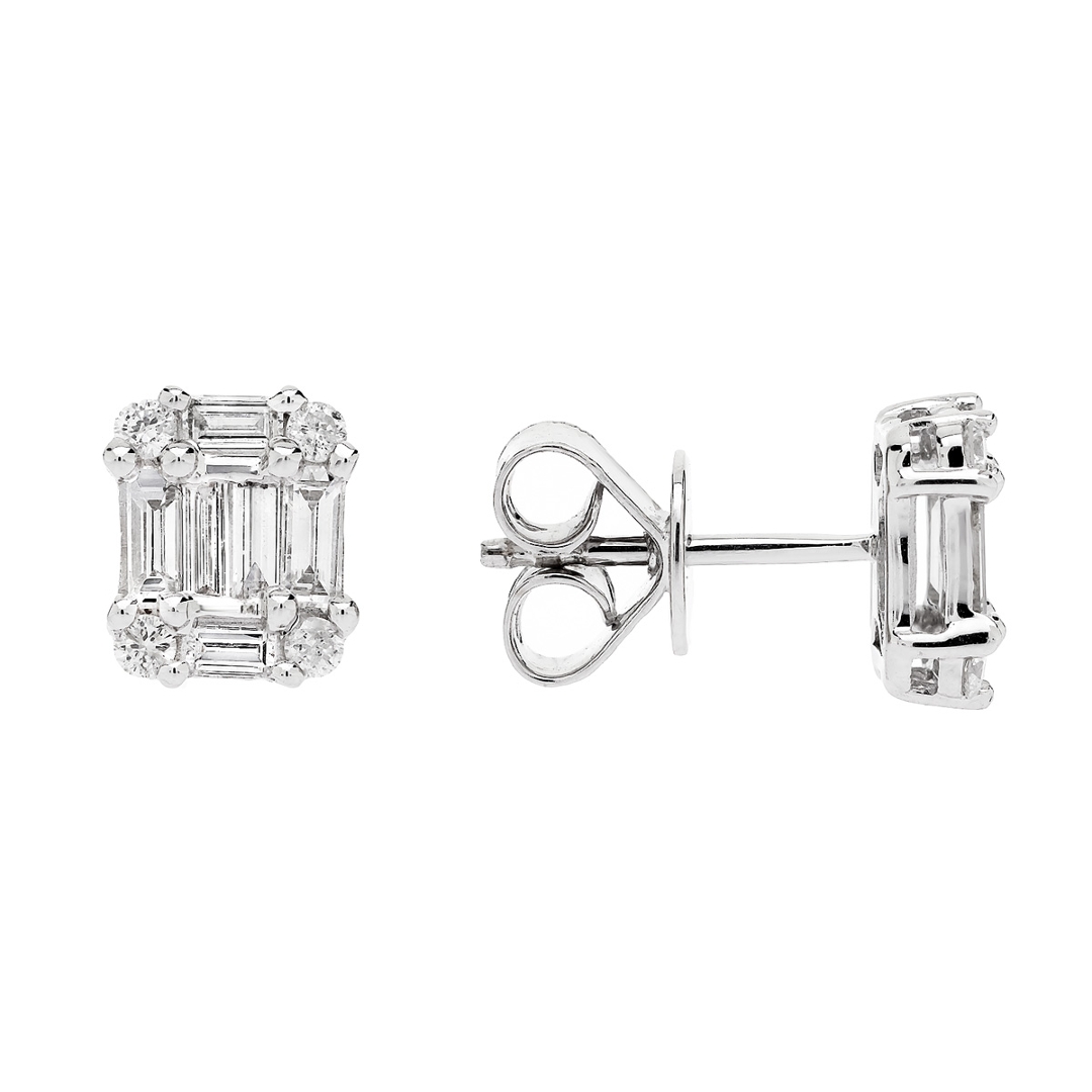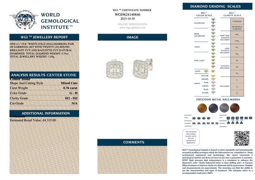 A brand-new, unused, certified pair of natural diamond cushion-shaped cluster earrings, this exquisite set captures the perfect balance between classic design and modern brilliance. Each earring features a stunning arrangement of brilliant-cut and baguette-cut natural diamonds, together weighing 0.76 carats. The diamonds, graded G–H in colour and SI1–SI2 in clarity, radiate exceptional sparkle and purity, their expertly cut facets reflecting light with captivating fire and precision. The combination of cuts creates a mesmerising play of texture and brilliance, enhancing the earrings’ timeless yet contemporary appeal.