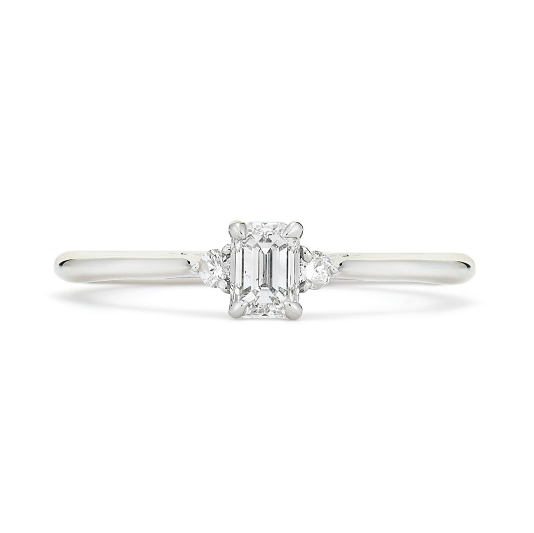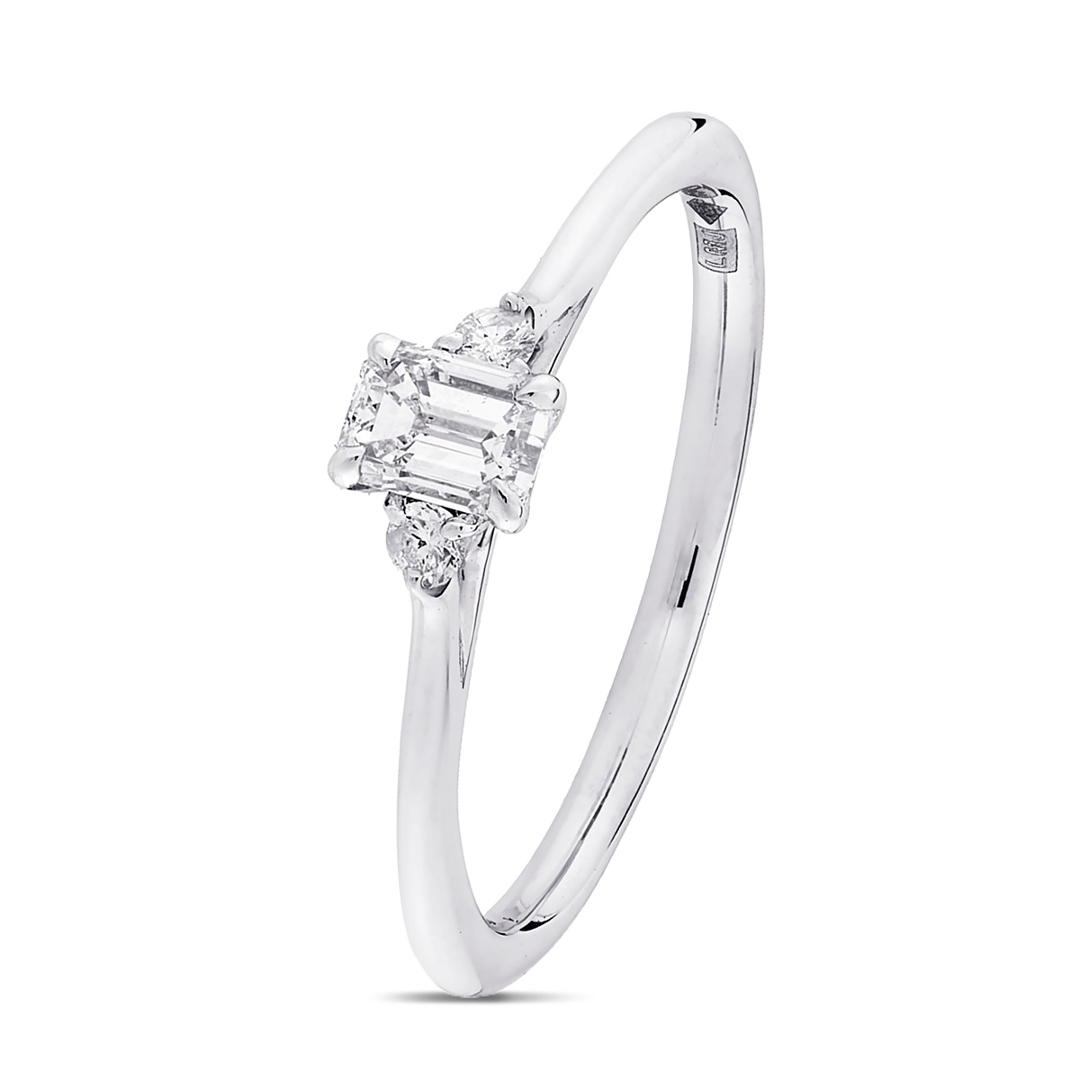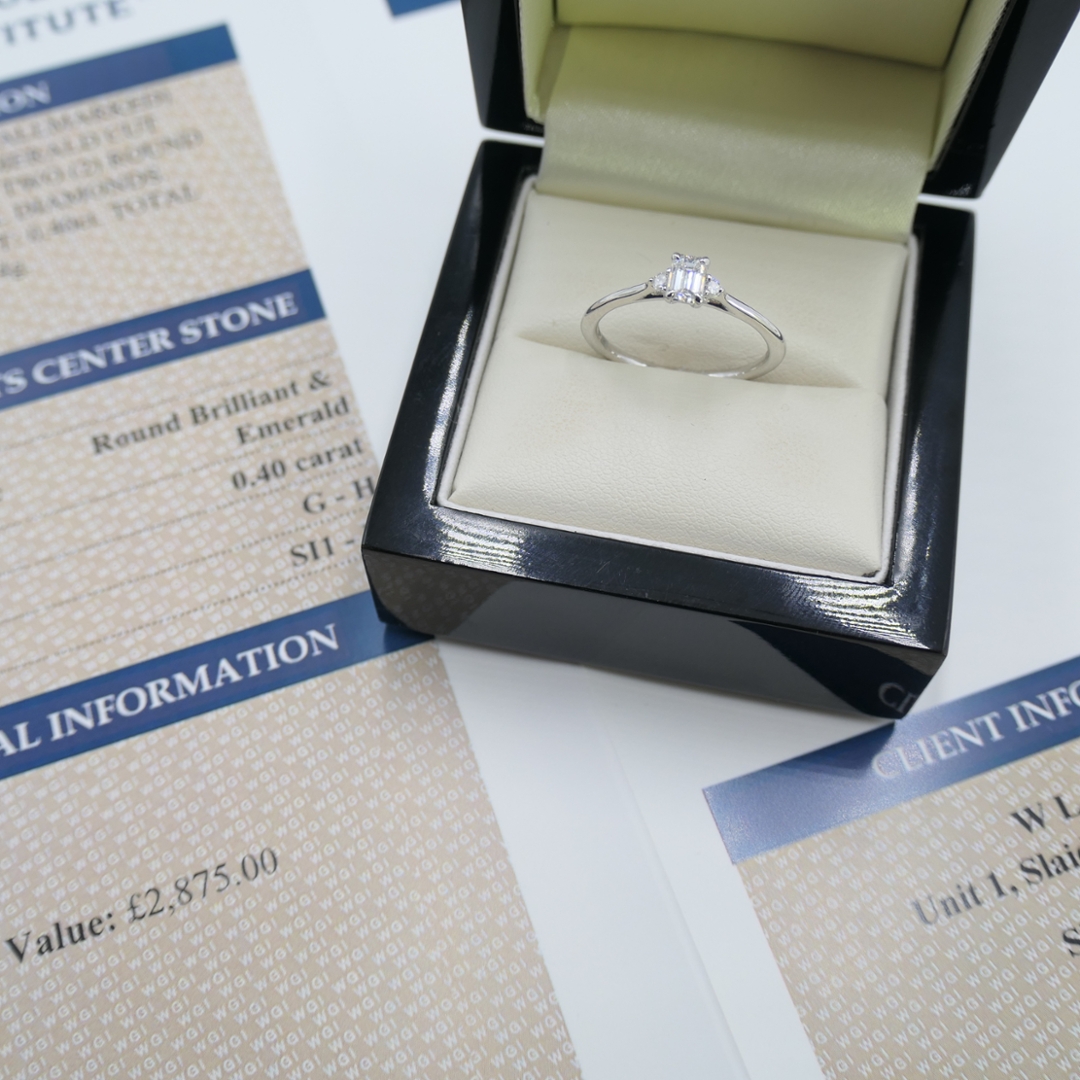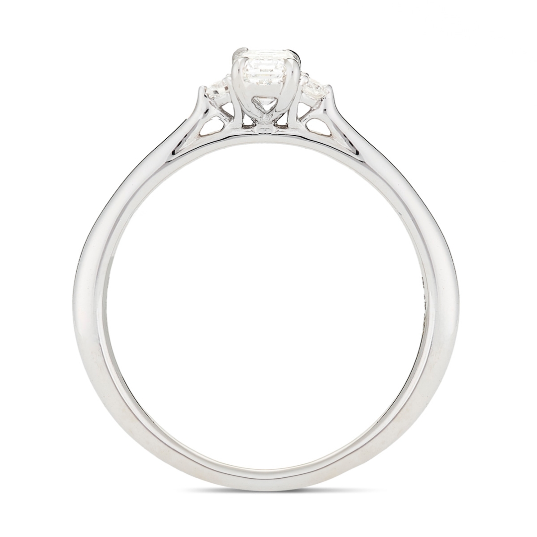 The total diamond weight is 0.40ct. The emerald-cut diamond creates a sleek, elongated silhouette that enhances its natural fire. The brilliant-cut diamonds on the sides add radiance, further enhancing the ring's overall brilliance. The diamonds have been graded SI1-I1 for clarity and G-H for colour, ensuring they shine with beautiful sparkle and clarity.