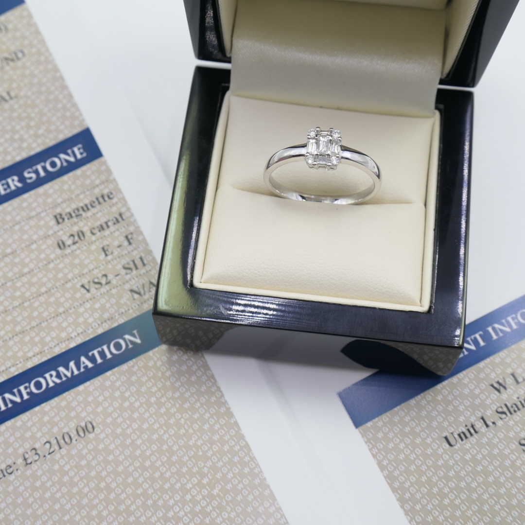 Valued at £3,210.00, this certified diamond emerald-shaped cluster ring represents a meaningful investment in fine jewellery. Its certified status guarantees the authenticity and superior quality of the materials, offering assurance and confidence to the discerning buyer. Whether chosen to commemorate a special occasion or as a cherished gift, this diamond ring embodies luxury, sophistication, and timeless elegance, making it a treasured addition to any jewellery collection.