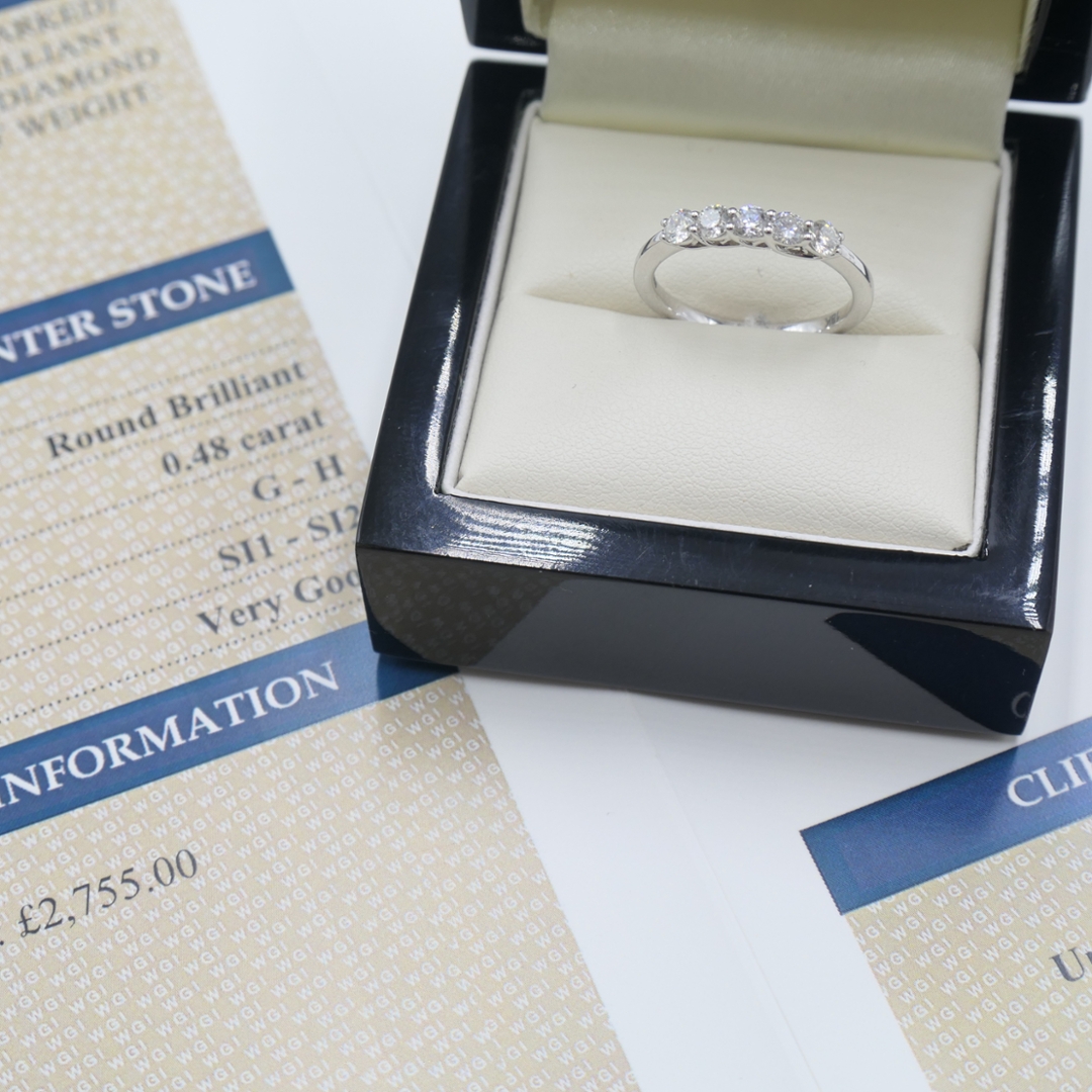With a total diamond weight of 0.48 carats, the five brilliant-cut diamonds are graded SI1-SI2 for clarity, ensuring minimal inclusions that allow light to pass through freely, enhancing their brilliance. The diamonds also boast a colour grade of G-H, indicating near-colourlessness, which contributes to their radiant, icy-white sparkle and perfectly complements the lustrous white gold setting.