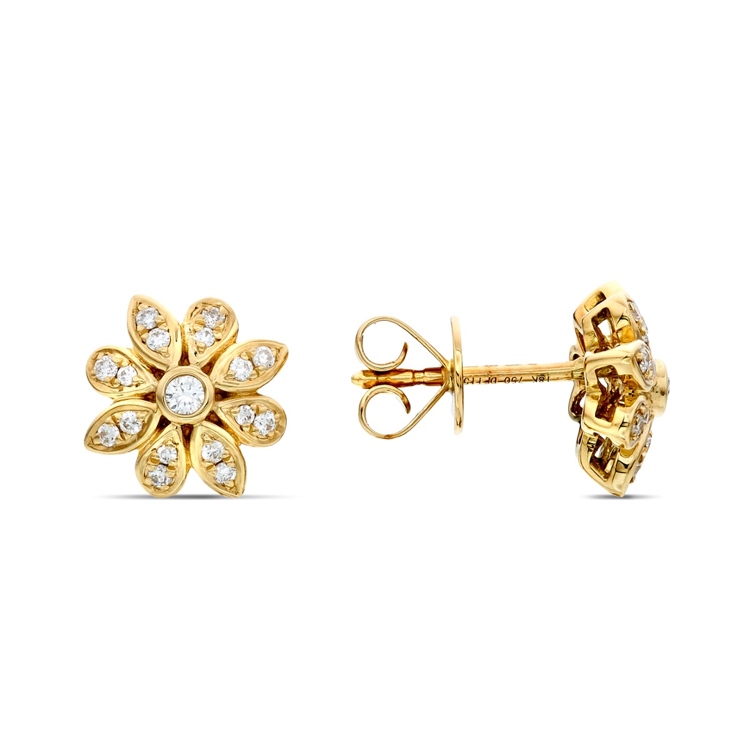 A brand-new, unused, certified pair of natural diamond flower-shaped cluster earrings, with a cluster of brilliant cut diamonds, set in 18ct yellow gold.