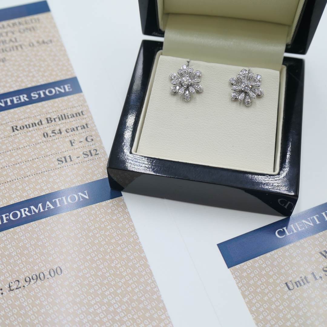 A brand-new, unused certified pair of natural diamond flower-shaped cluster earrings that perfectly capture timeless grace and refined elegance. Crafted in luminous 18ct white gold, these exquisite earrings feature a delicate floral design set with a 0.54-carat cluster of brilliant-cut natural diamonds. Each diamond, graded F–G in colour and SI1–SI2 in clarity, has been hand-selected for its radiant sparkle and balance, creating a mesmerising brilliance that glows with every movement. The refined symmetry of the flower motif enhances the natural beauty of the diamonds, while the white gold setting accentuates their purity and shimmer with a cool, contemporary touch.