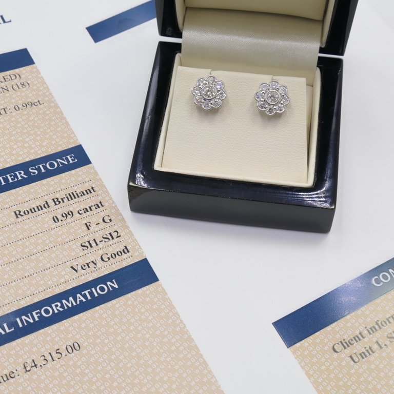 A brand new, unused, certified pair of natural diamond flower-shaped cluster earrings, exquisitely crafted in 18ct white gold and weighing 3.35 grams. These stunning earrings feature a total of 0.99ct of brilliant-cut natural diamonds, with clarity grades ranging from SI1 to SI2 and a fine colour range of F to G. The diamonds are expertly arranged in a delicate floral design, creating an enchanting sparkle that radiates elegance and femininity. Each facet captures the light beautifully, giving the earrings an exquisite brilliance that instantly draws attention.