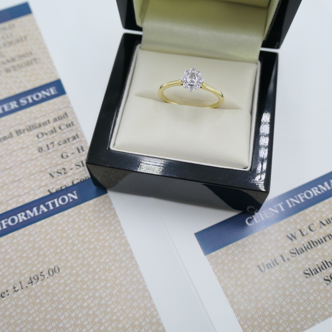 A brand-new, unused, certified 18ct yellow and white gold natural diamond flower-shaped cluster ring, set with one oval-cut diamond at the centre and surrounded by a halo of brilliant-cut diamonds. The total diamond weight is 0.17ct, with diamonds graded VS2-SI1 for clarity and G-H for colour, ensuring a beautiful combination of brilliance and clarity.