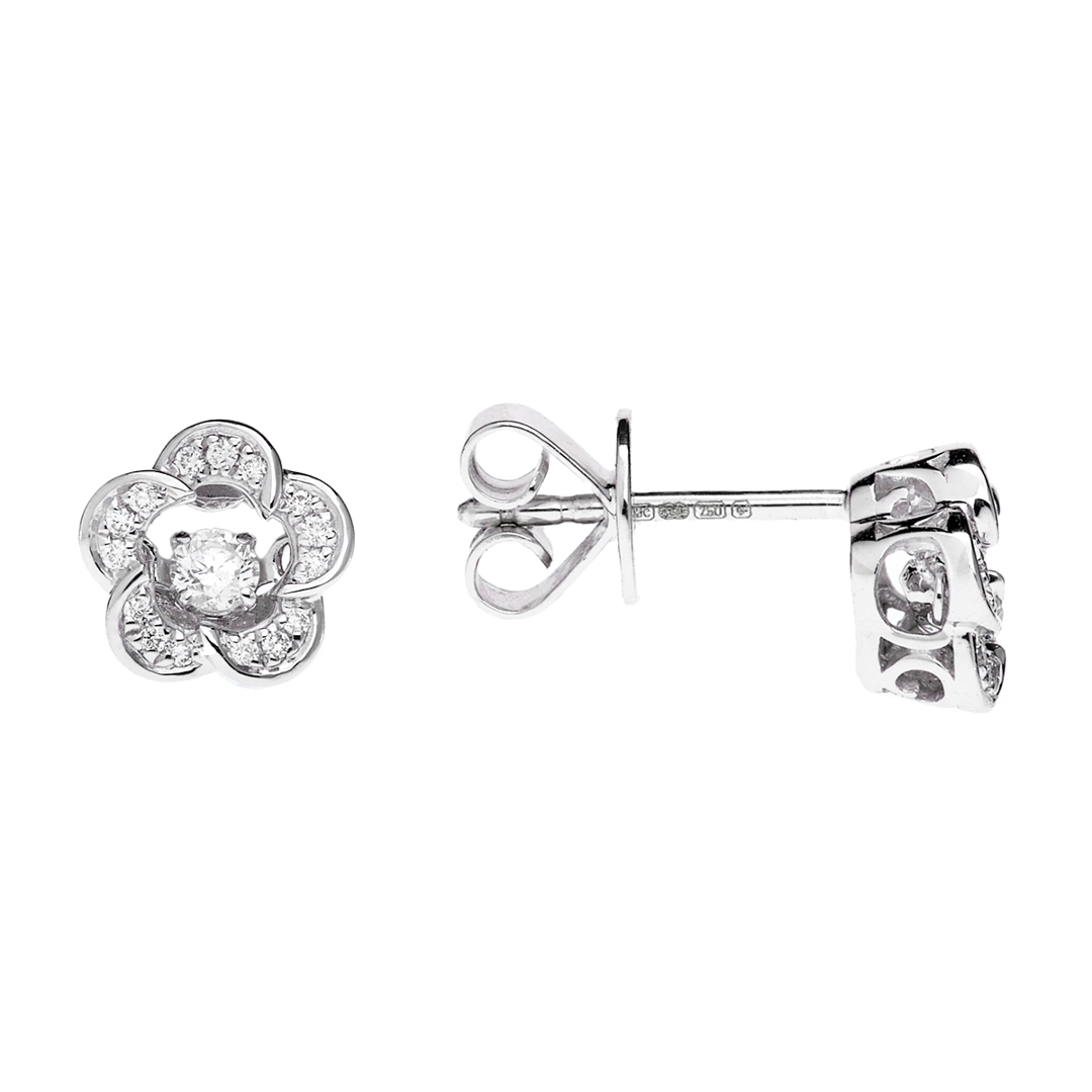 A brand new, unused, certified pair of natural diamond flower-shaped earrings, set with brilliant cut diamonds, set in 18ct white gold.