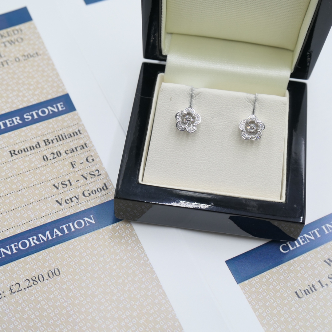 A brand-new, unused, certified 18ct white gold pair of natural diamond flower-shaped earrings, set with brilliant-cut diamonds, offers an exquisite blend of elegance and charm. Each earring features a total diamond weight of 0.20ct, showcasing diamonds with VS1-VS2 clarity and F-G colour, which ensures remarkable brilliance and sparkle.