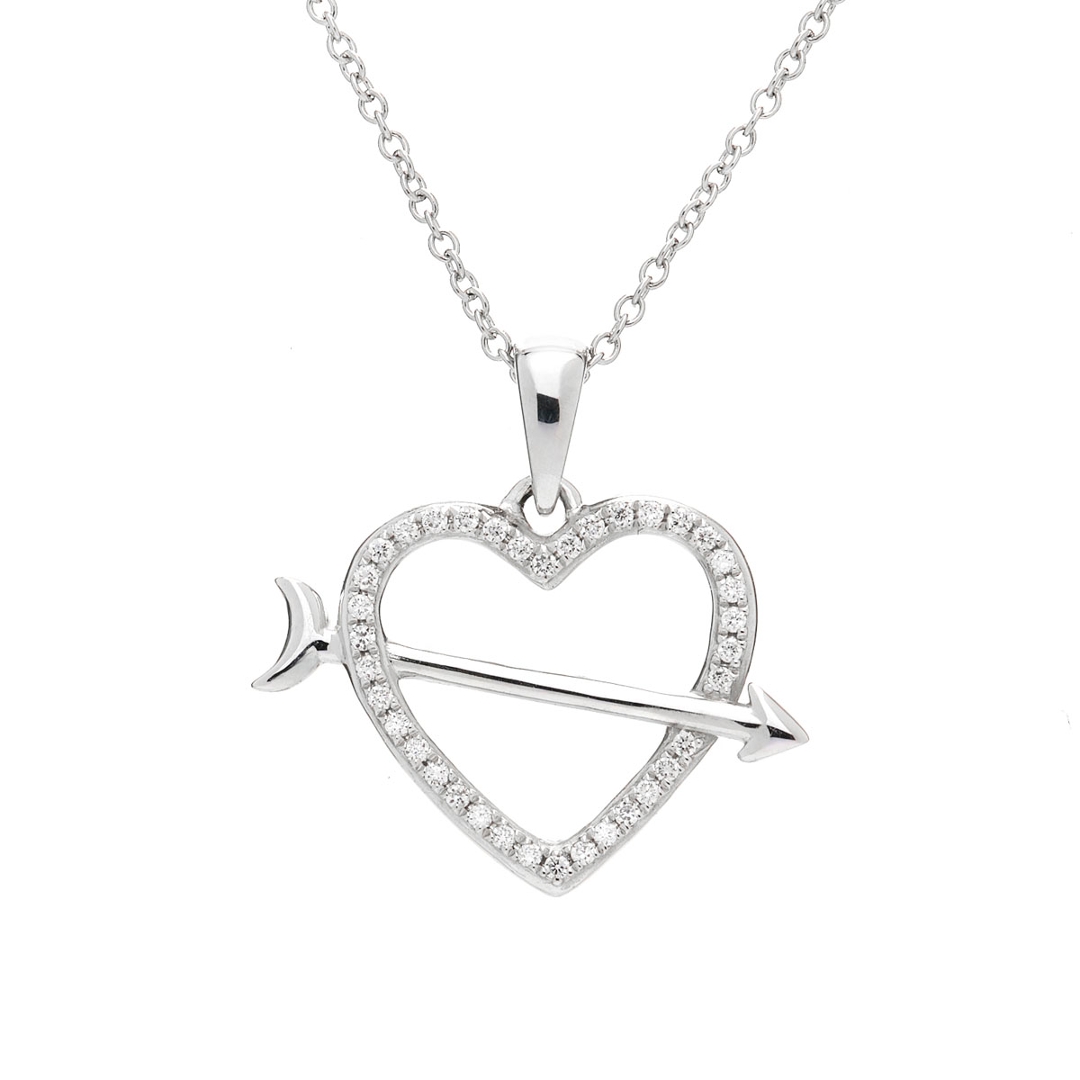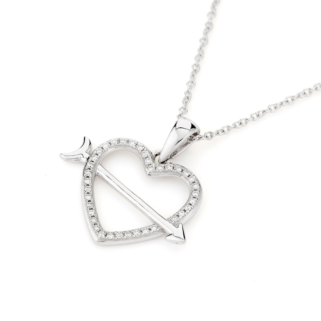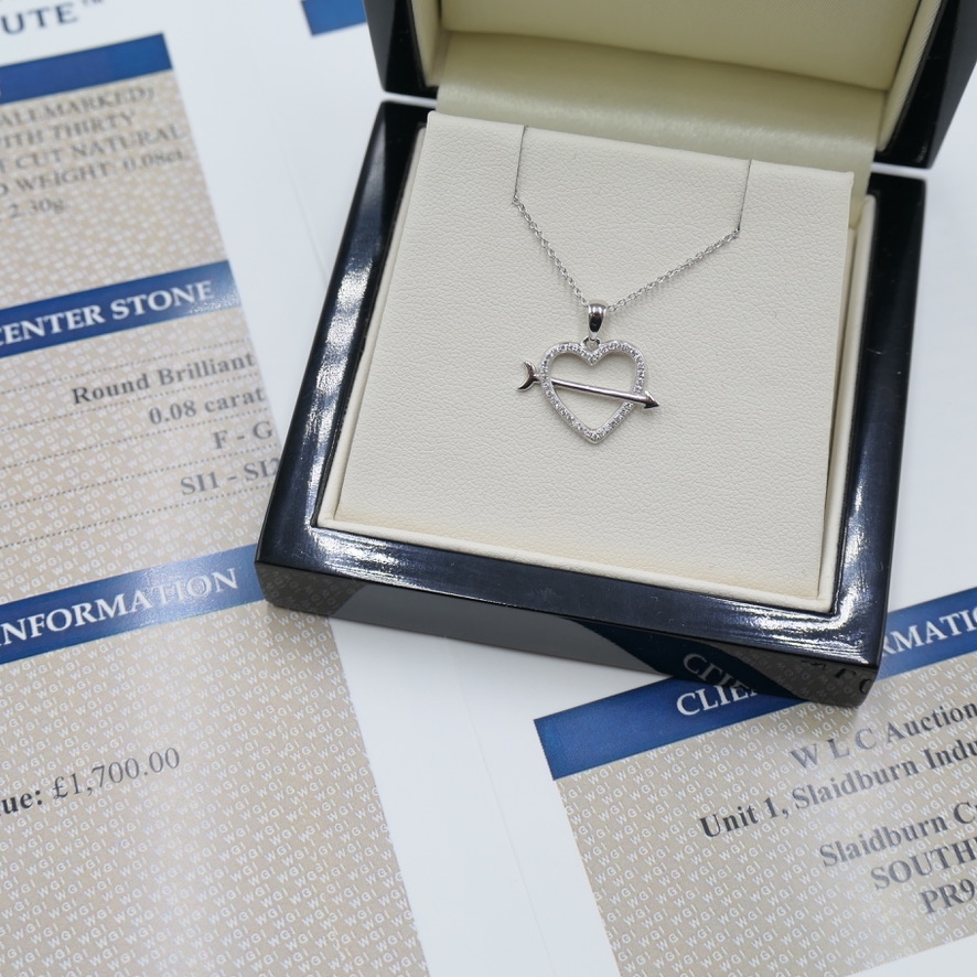A brand-new, unused certified 18ct white gold natural diamond heart and arrow-shaped cluster pendant, designed to symbolise the beauty of love and the excitement of destiny. Set with a sparkling cluster of brilliant-cut natural diamonds, this elegant piece weighs 0.08ct and features each stone with SI1-SI2 clarity and F-G colour. The sleek white gold setting enhances the diamonds' lively brilliance, creating a radiant look that captures both the eye and the heart. The charming heart-and-arrow design adds a playful yet meaningful touch, perfect for marking a special moment or a lasting bond.