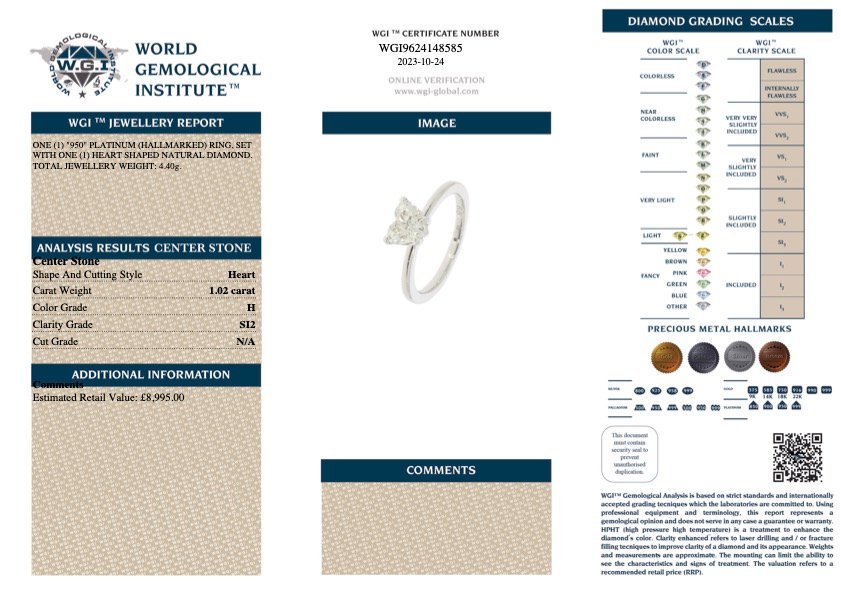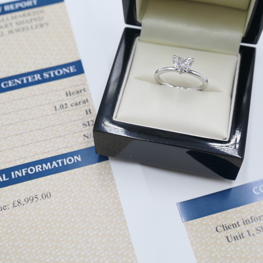 A brand-new, unused, certified-platinum natural-diamond solitaire engagement ring symbolises love and commitment. A stunning 1.02ct heart-cut diamond takes centre stage, capturing the essence of romance with its elegant and unique shape. Graded SI2 for clarity and H for colour, the diamond radiates brilliance, offering a captivating sparkle that symbolises everlasting devotion. The sleek, polished platinum setting enhances the diamond's beauty, providing a durable, timeless foundation that complements its exceptional fire and elegance. The diamond weighs 4.40 grams.