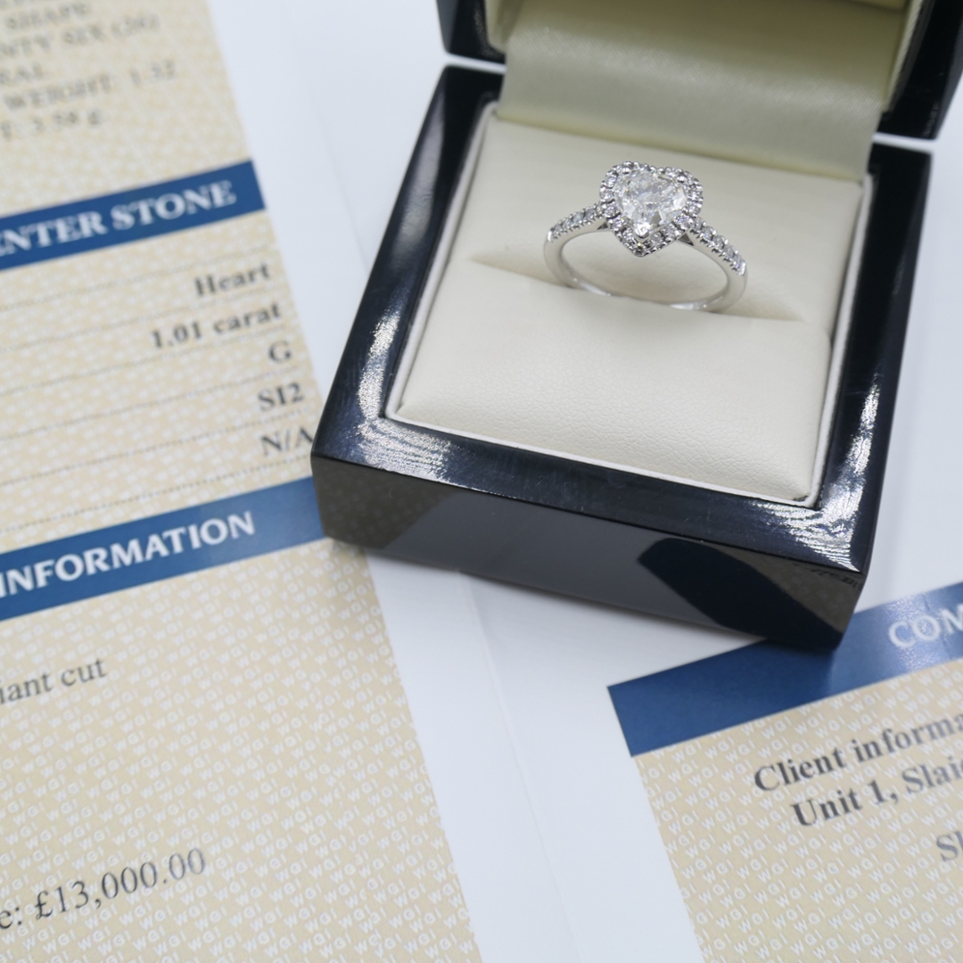 A brand-new, unused certified natural diamond solitaire engagement ring that radiates romance and refined beauty. At its centre lies a stunning 1.01-carat heart-cut natural diamond, graded G in colour and SI2 in clarity, symbolising love and devotion through its enchanting shape and captivating brilliance. Surrounding the centre stone is a halo of brilliant-cut diamonds, with additional diamonds set along the shoulders for added sparkle and dimension. These accent stones total 0.31 carats and are graded G–H in colour and VS–SI in clarity, enhancing the central diamond’s radiance and creating a dazzling display of fire and light.